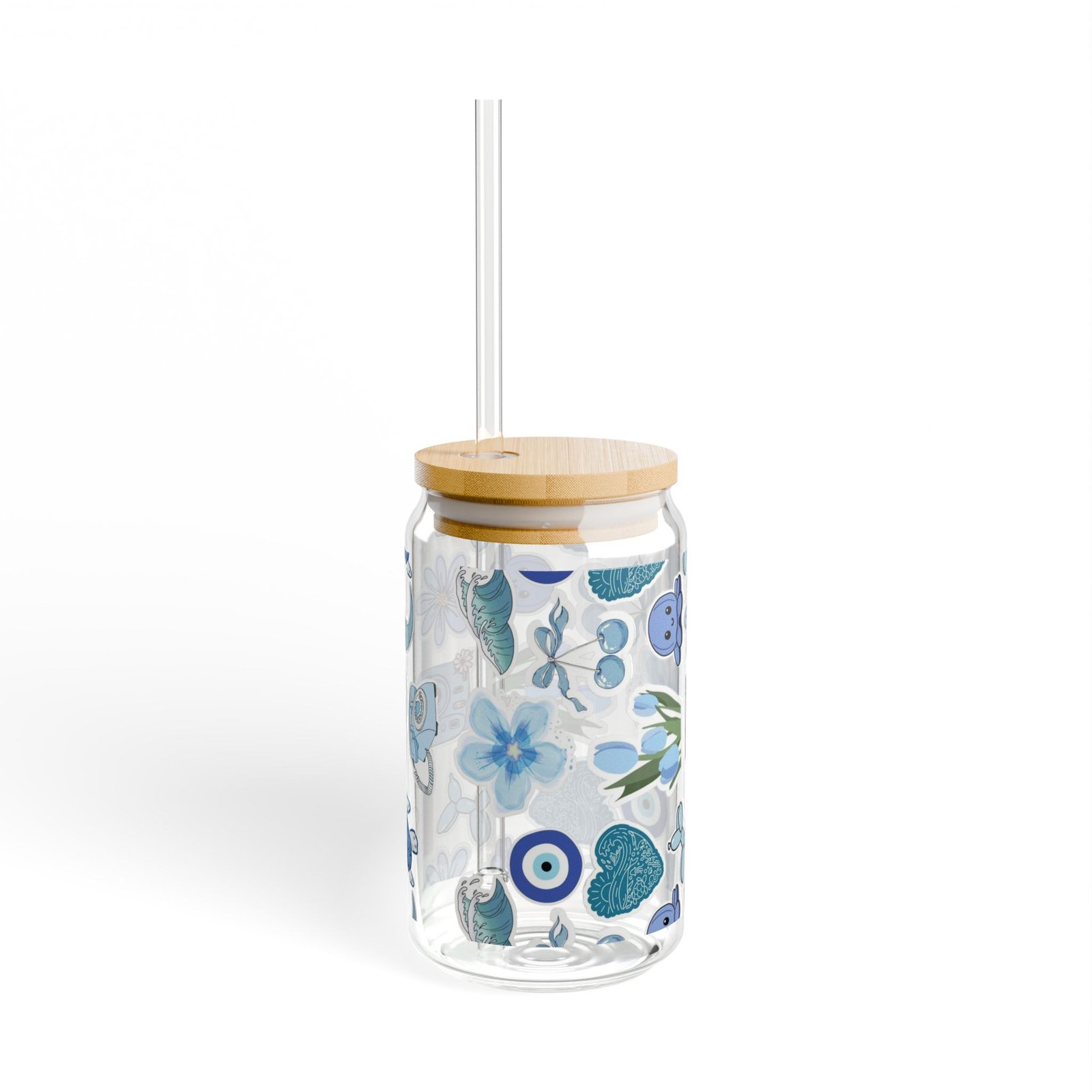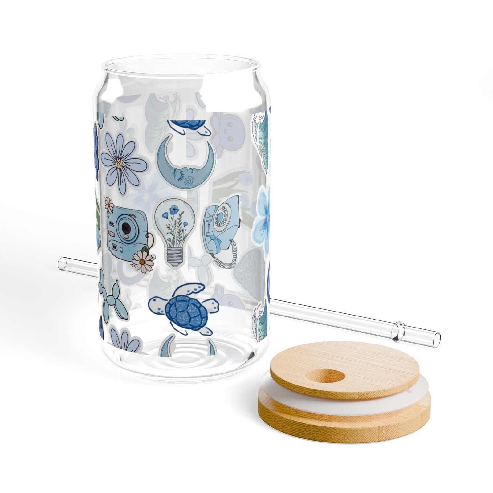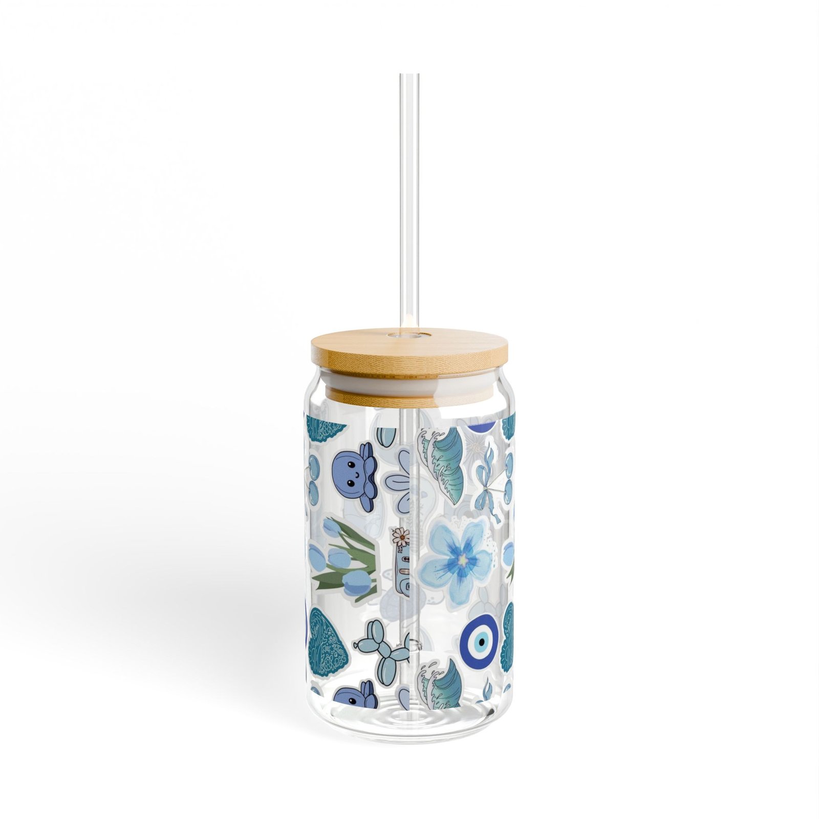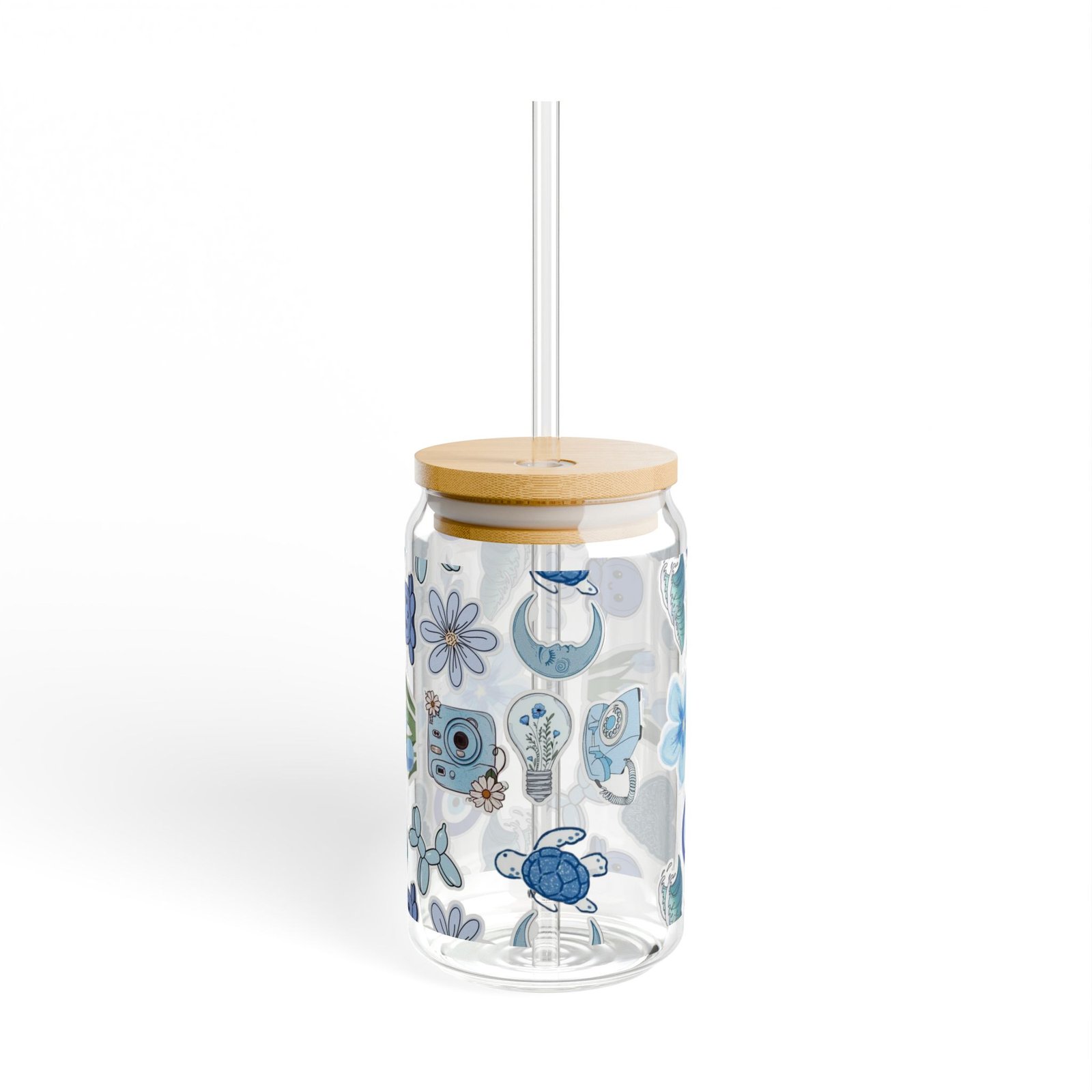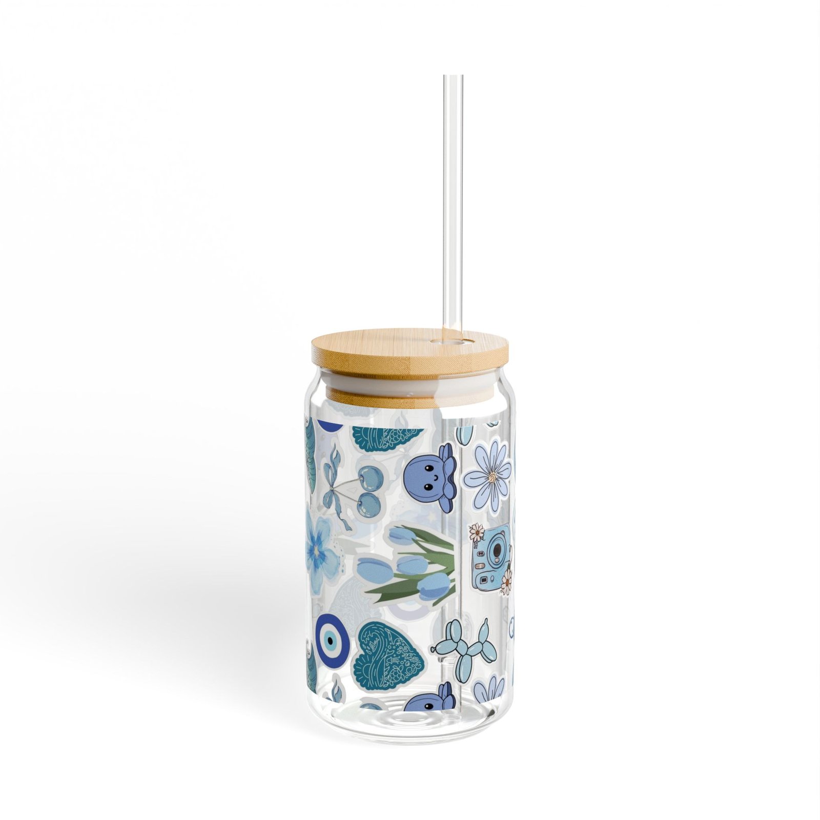 This 16oz sipper glass brings a playful, hand-drawn charm to everyday sipping. Clear tempered glass showcases a collage of blue florals, hearts, buttons and tiny motifs that feel both vintage and fresh. Choose the bamboo push lid with a clear Tritan straw for a light, natural look that’s durable and easy to carry, or go without the lid for simple, tabletop use. The print is bright and crisp, so the artwork stays lively against coffee, iced tea, smoothies or infused water. It’s made in the USA from globally sourced materials and is BPA-free — a cheerful, low-key addition to a cozy kitchen or creative workspace.