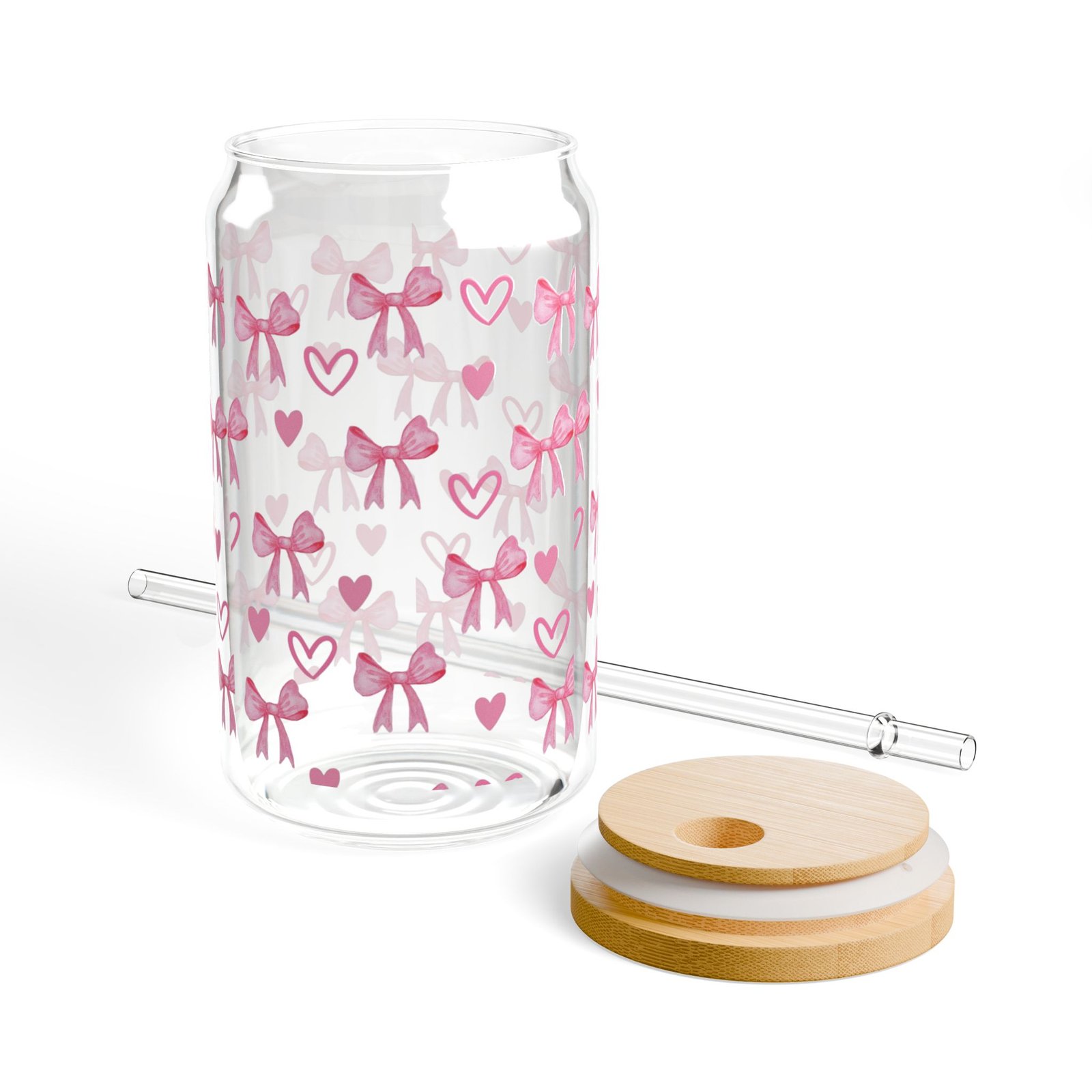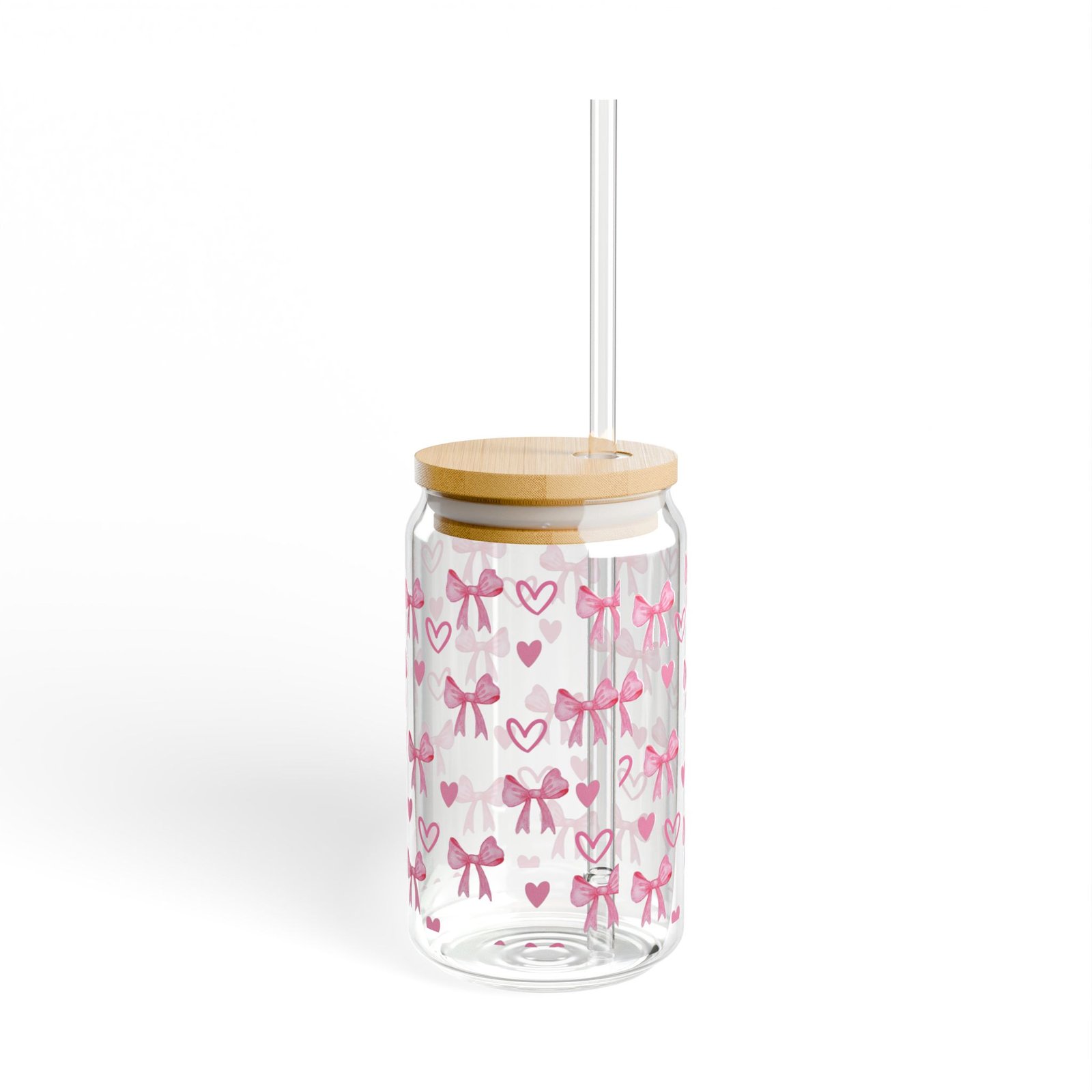 This 16oz sipper glass brings a playful, hand-drawn charm to everyday sipping. Clear tempered glass showcases a repeat pattern of soft pink bows and hearts that feels like a note passed in class or a quiet moment of whimsy. Choose the bamboo push-gasket lid and clear Tritan straw to carry your iced tea, lemonade, or infused water on the go — the straw stays resilient through temperature changes while the lid adds a warm, natural contrast to the bright print. Lightweight and BPA-free, the glass is made in the USA from globally sourced materials and designed to keep colors vibrant. Hand wash only to preserve the print and bamboo finish.