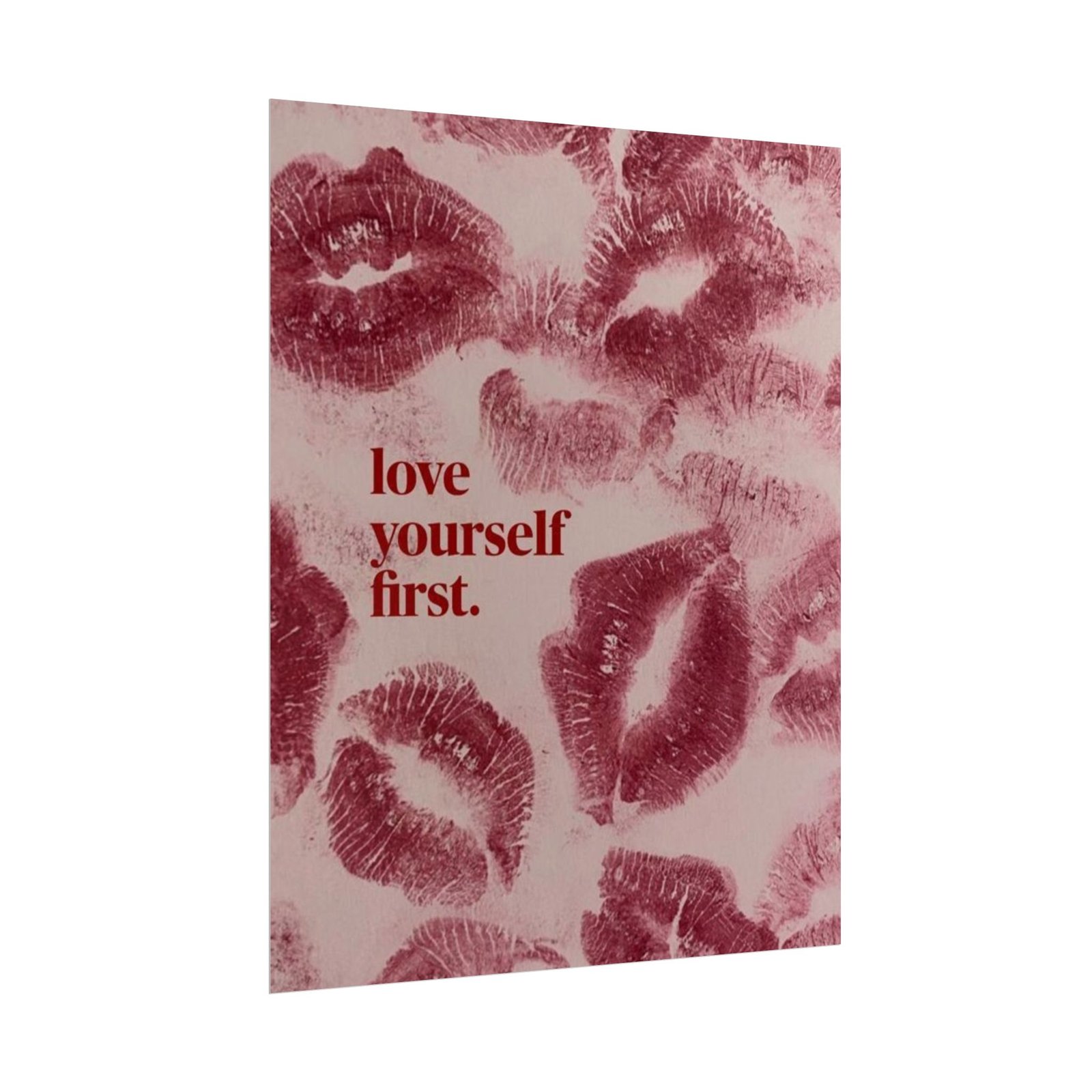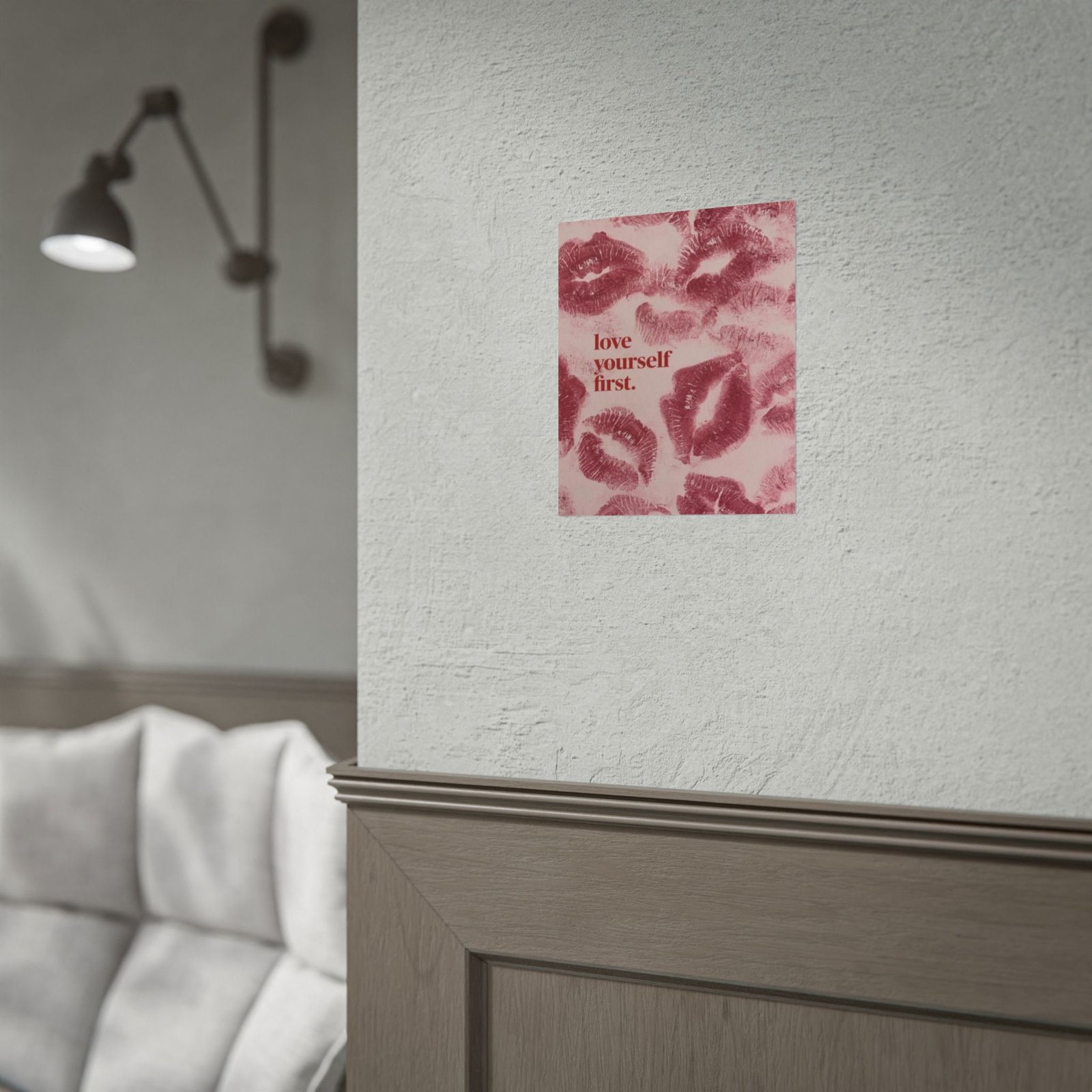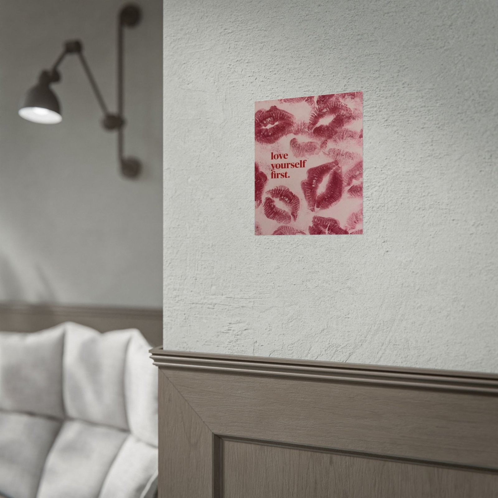 A rolled art poster that speaks softly and clearly: muted blush background, scattered lipstick kiss prints in warm berry tones, and the quiet reminder “love yourself first.” It brings an intimate, self-care vibe to a bedroom, studio, or reading nook, adding texture and warmth without shouting. Choose from archival fine art paper with a soft textured finish for a painterly feel, a satin semi-gloss for vivid color and sharp detail, or a muted matte for a subtle, low-sheen look. Available in horizontal and vertical layouts and multiple sizes to fit gallery walls, bedside corners, or desk displays. Shipped rolled for safe, crease-free arrival—unwrap it and let the message settle into your space.