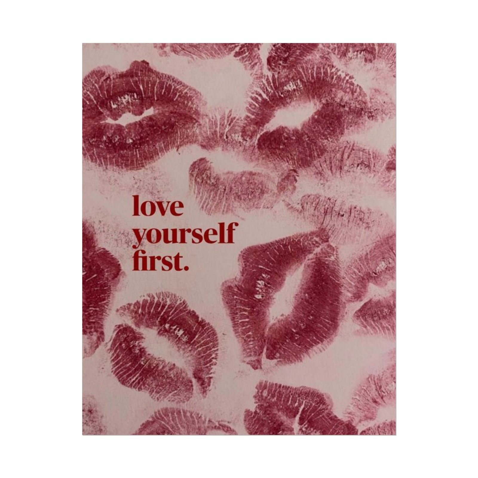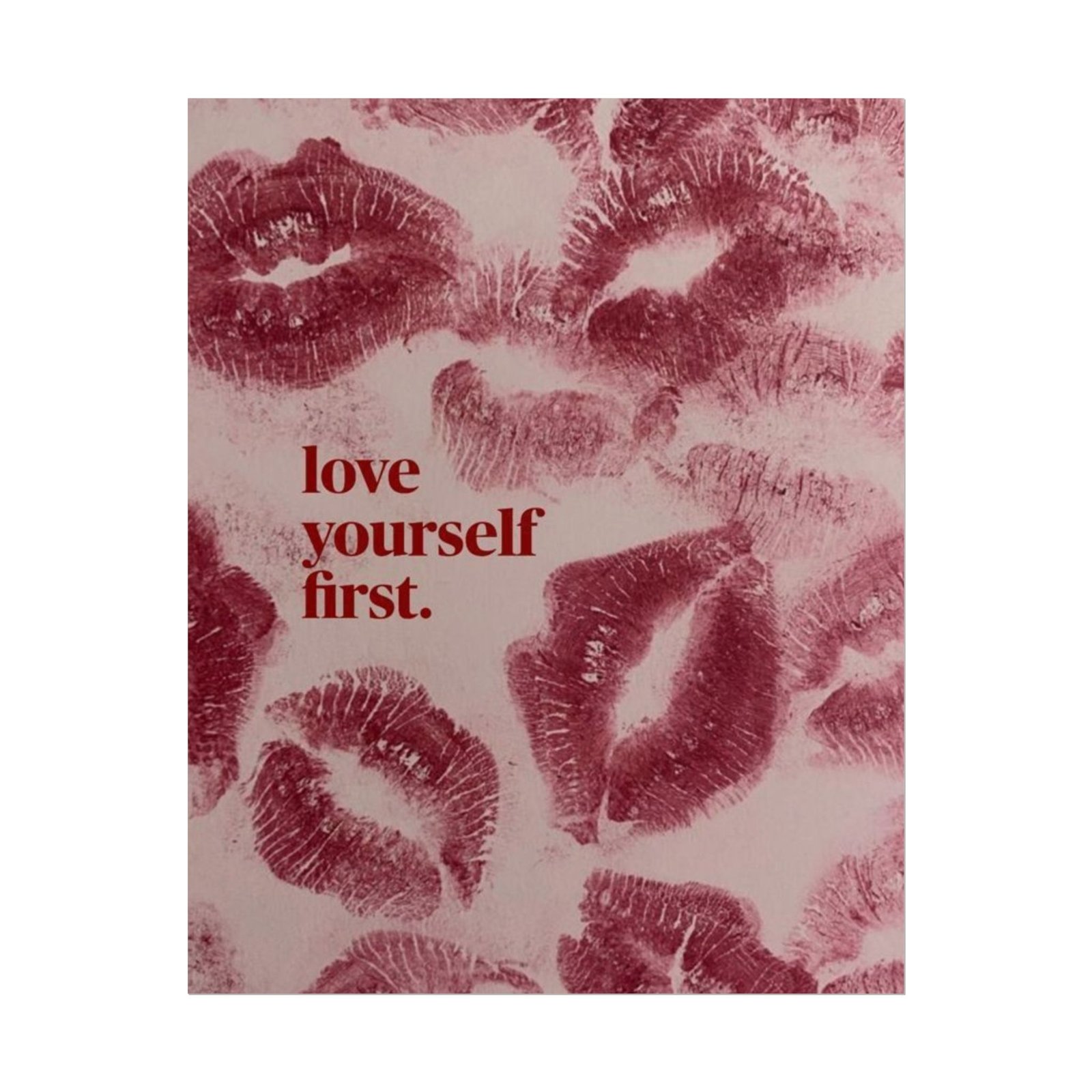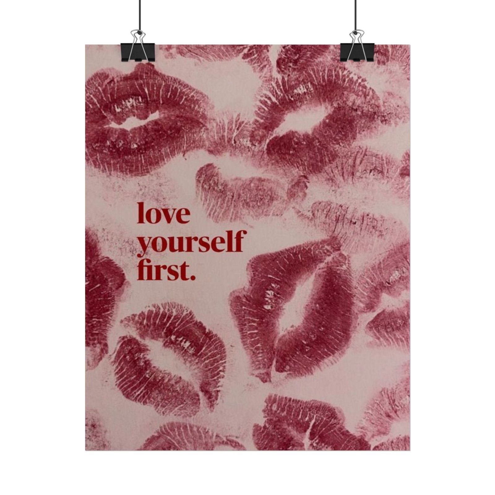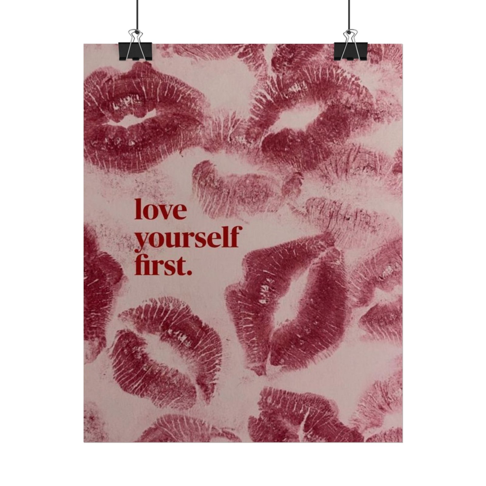 A rolled art poster that speaks softly and clearly: muted blush background, scattered lipstick kiss prints in warm berry tones, and the quiet reminder “love yourself first.” It brings an intimate, self-care vibe to a bedroom, studio, or reading nook, adding texture and warmth without shouting. Choose from archival fine art paper with a soft textured finish for a painterly feel, a satin semi-gloss for vivid color and sharp detail, or a muted matte for a subtle, low-sheen look. Available in horizontal and vertical layouts and multiple sizes to fit gallery walls, bedside corners, or desk displays. Shipped rolled for safe, crease-free arrival—unwrap it and let the message settle into your space.