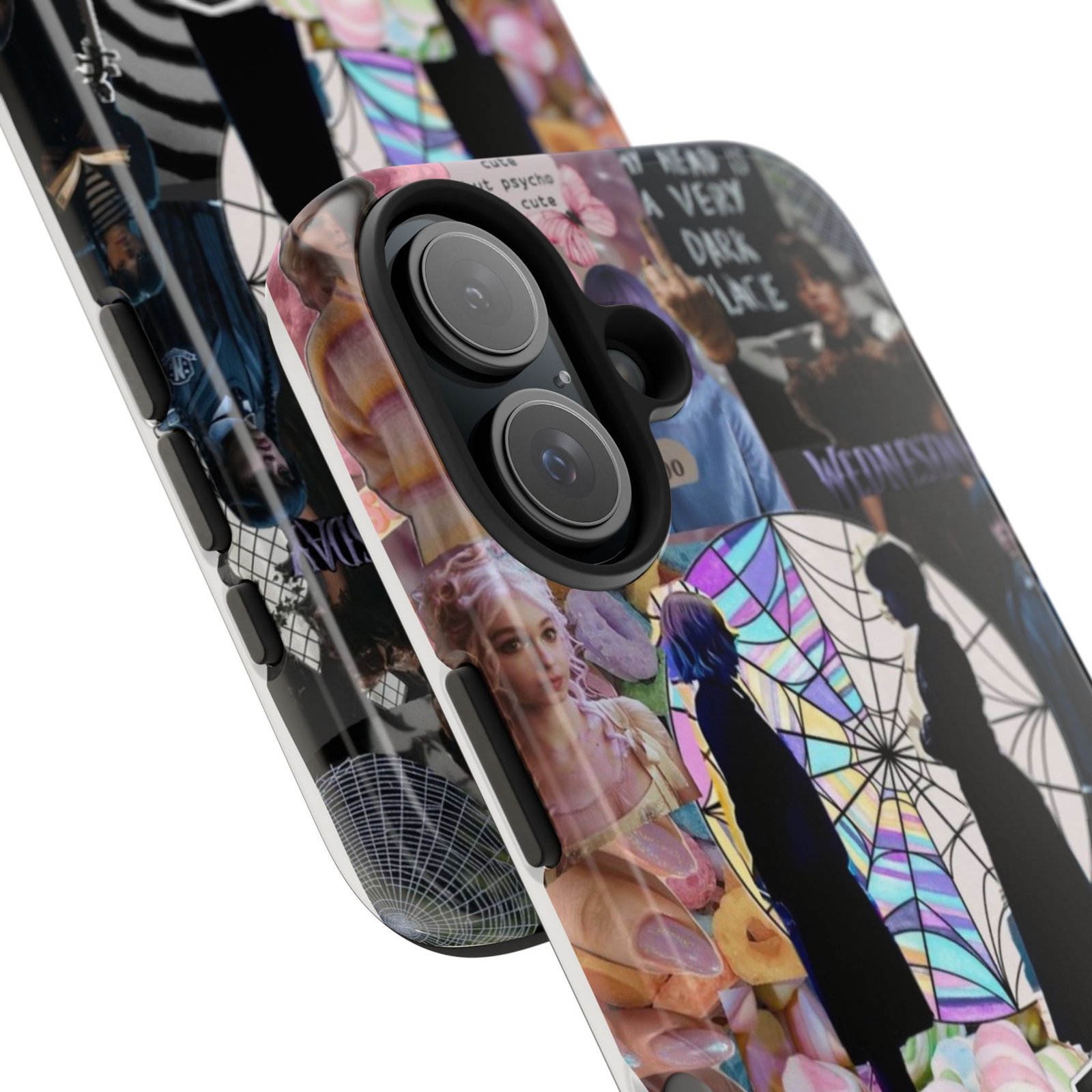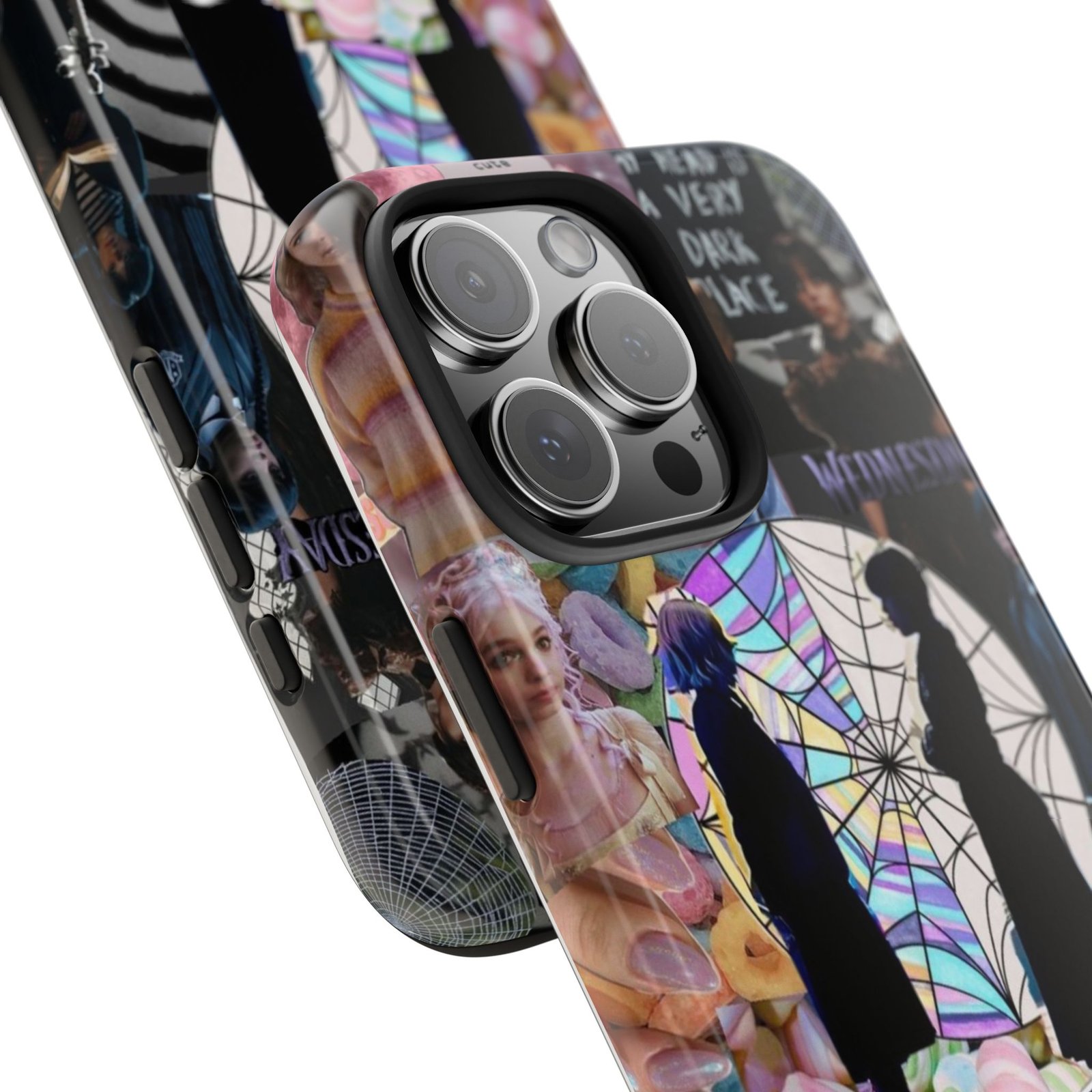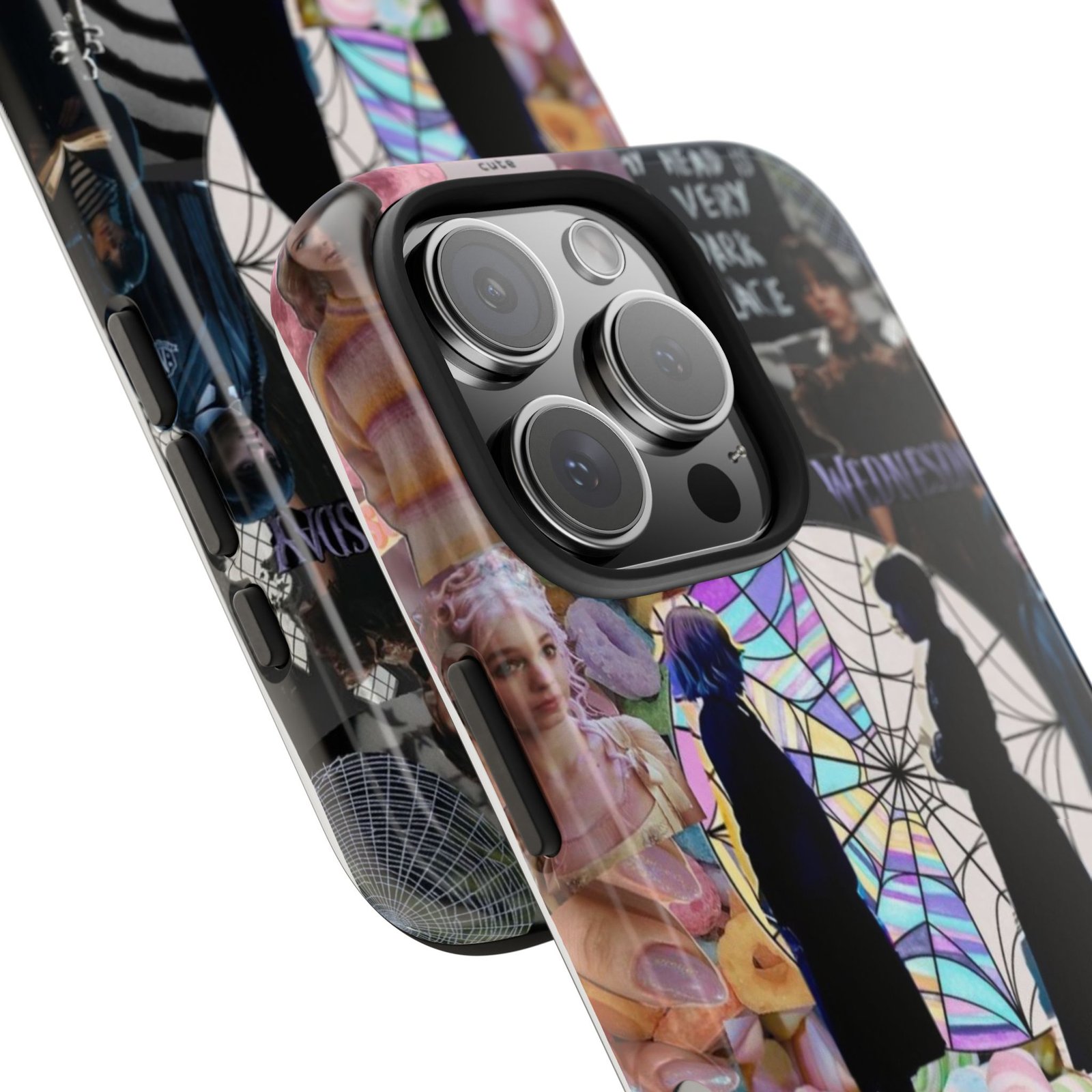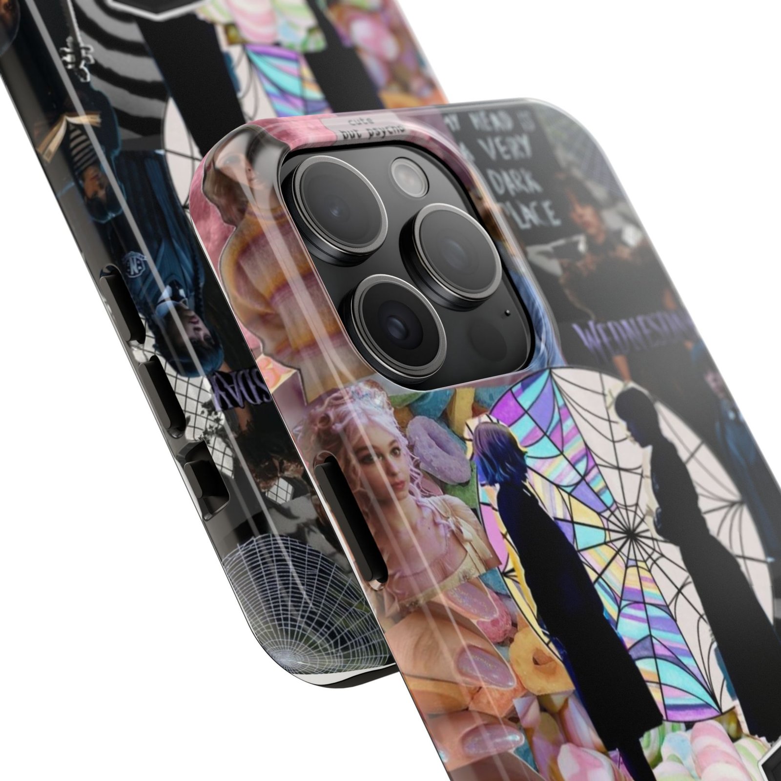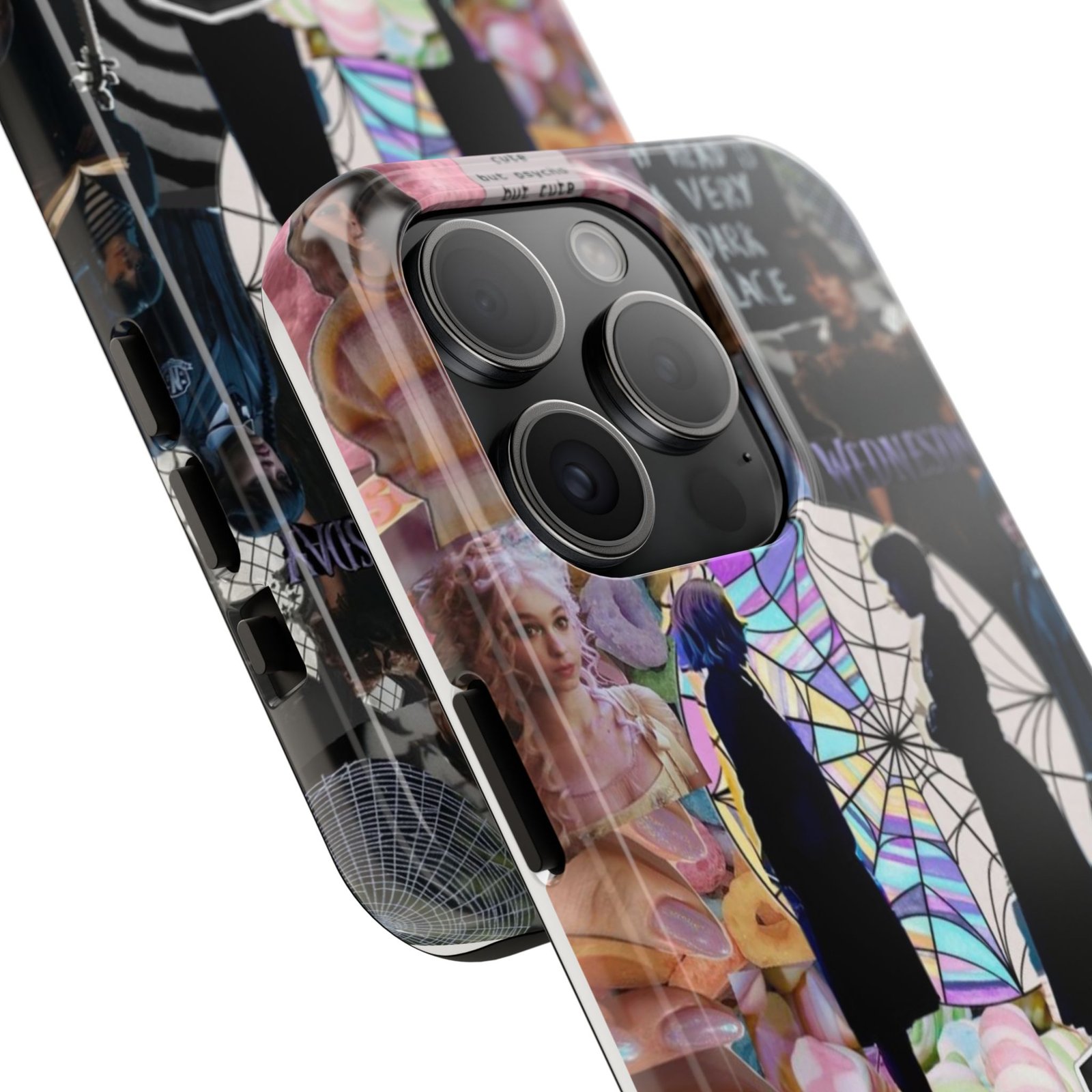 A splash of moody charm for your daily carry. This durable phone case blends glossy, high-definition art with tough, impact-resistant construction so your phone looks expressive without sacrificing protection. The design layers shadowy silhouettes, stained-glass spiderweb motifs, and soft pastel florals to create a slightly spooky, nostalgic collage that feels hand-curated. Lightweight yet sturdy, it slips on easily and keeps your screen raised off flat surfaces. Carry a piece of your aesthetic everywhere — from late-night coffee runs to study sessions and themed meetups.