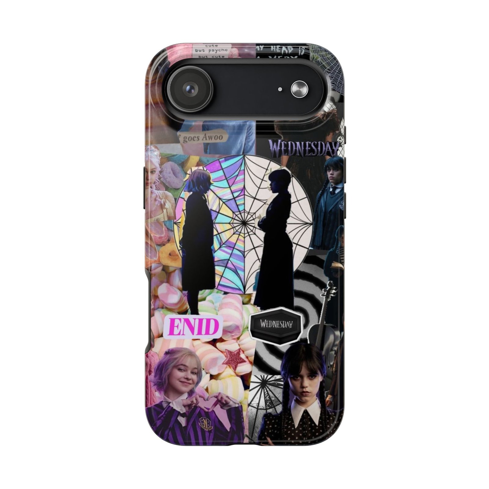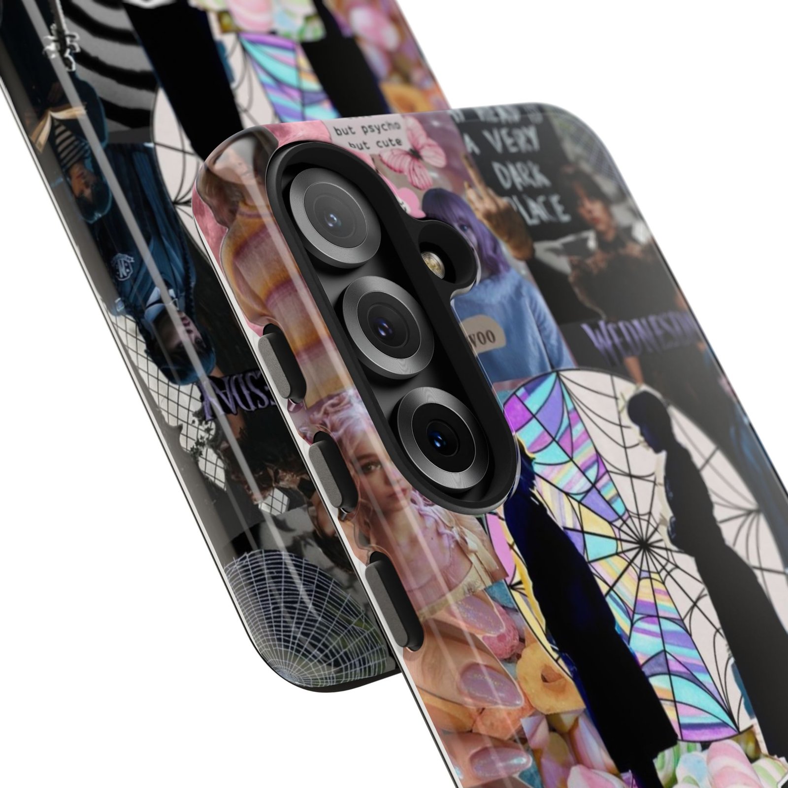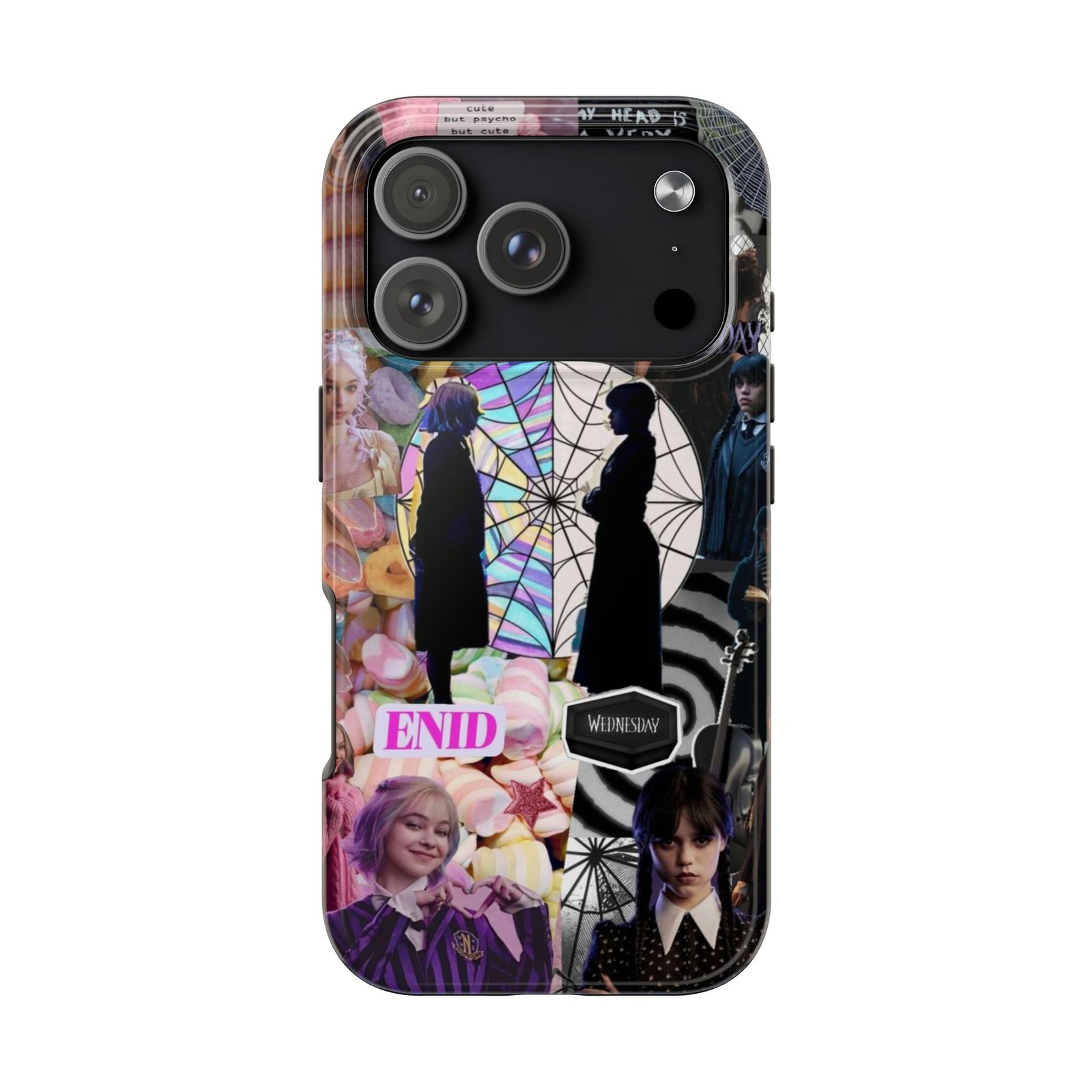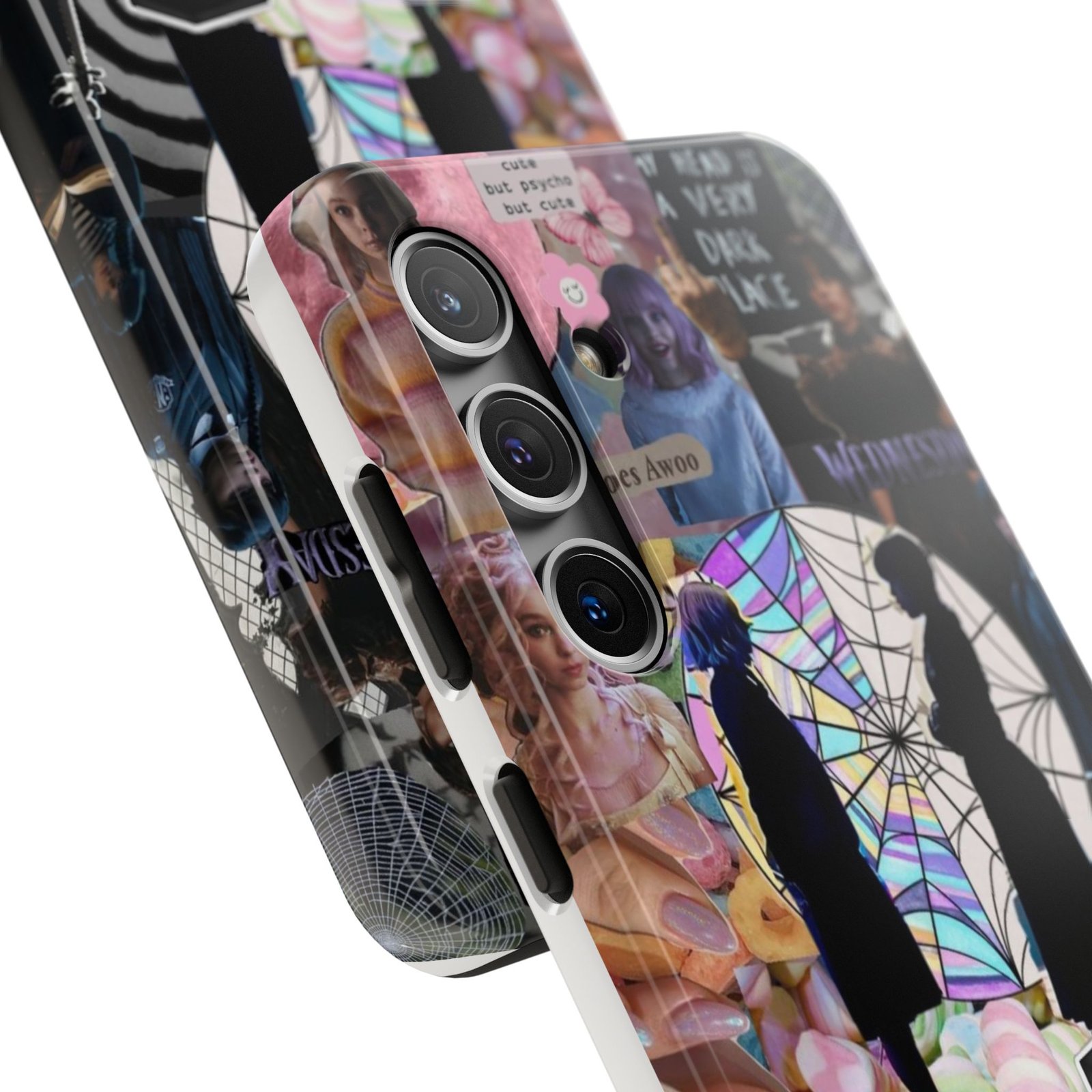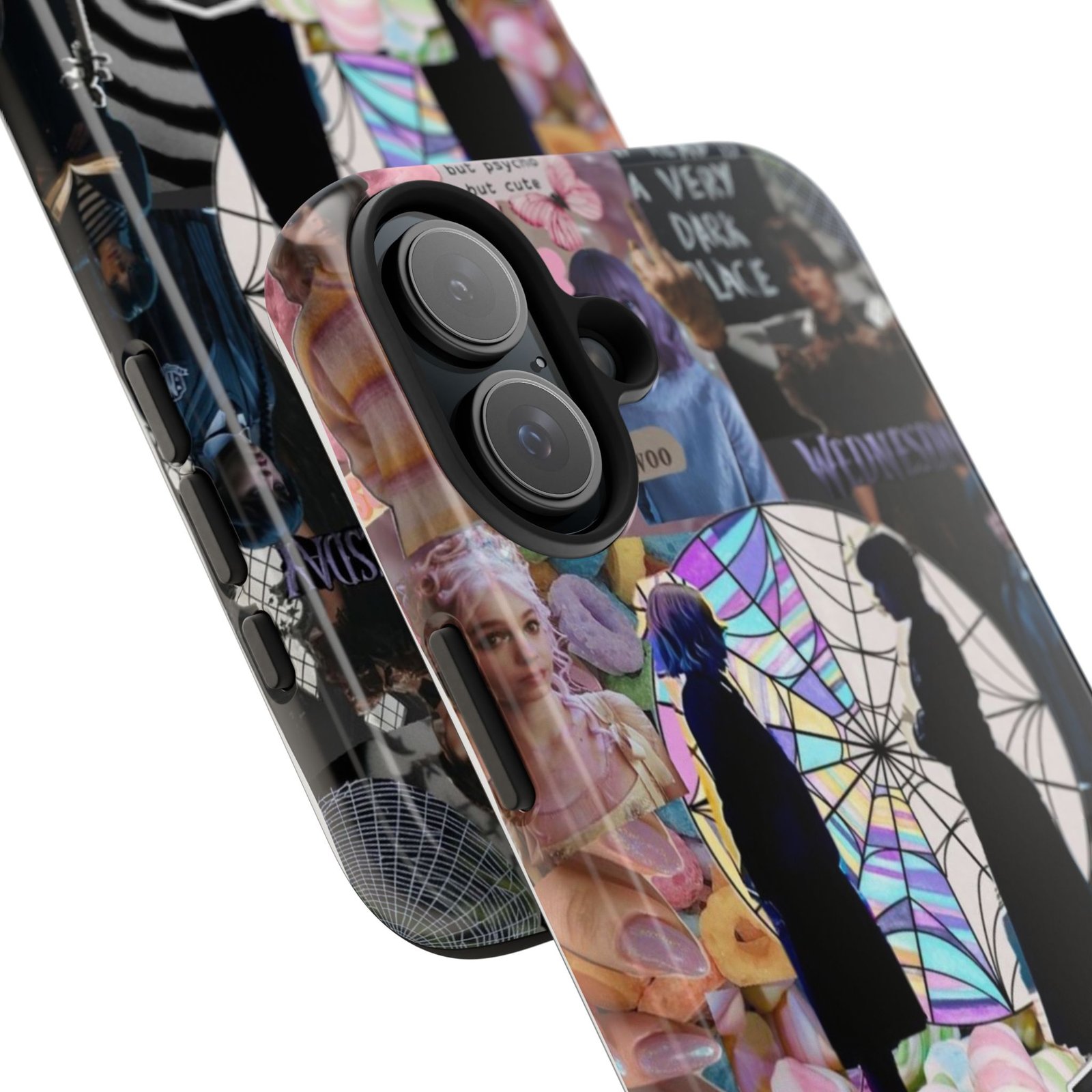 A splash of moody charm for your daily carry. This durable phone case blends glossy, high-definition art with tough, impact-resistant construction so your phone looks expressive without sacrificing protection. The design layers shadowy silhouettes, stained-glass spiderweb motifs, and soft pastel florals to create a slightly spooky, nostalgic collage that feels hand-curated. Lightweight yet sturdy, it slips on easily and keeps your screen raised off flat surfaces. Carry a piece of your aesthetic everywhere — from late-night coffee runs to study sessions and themed meetups.