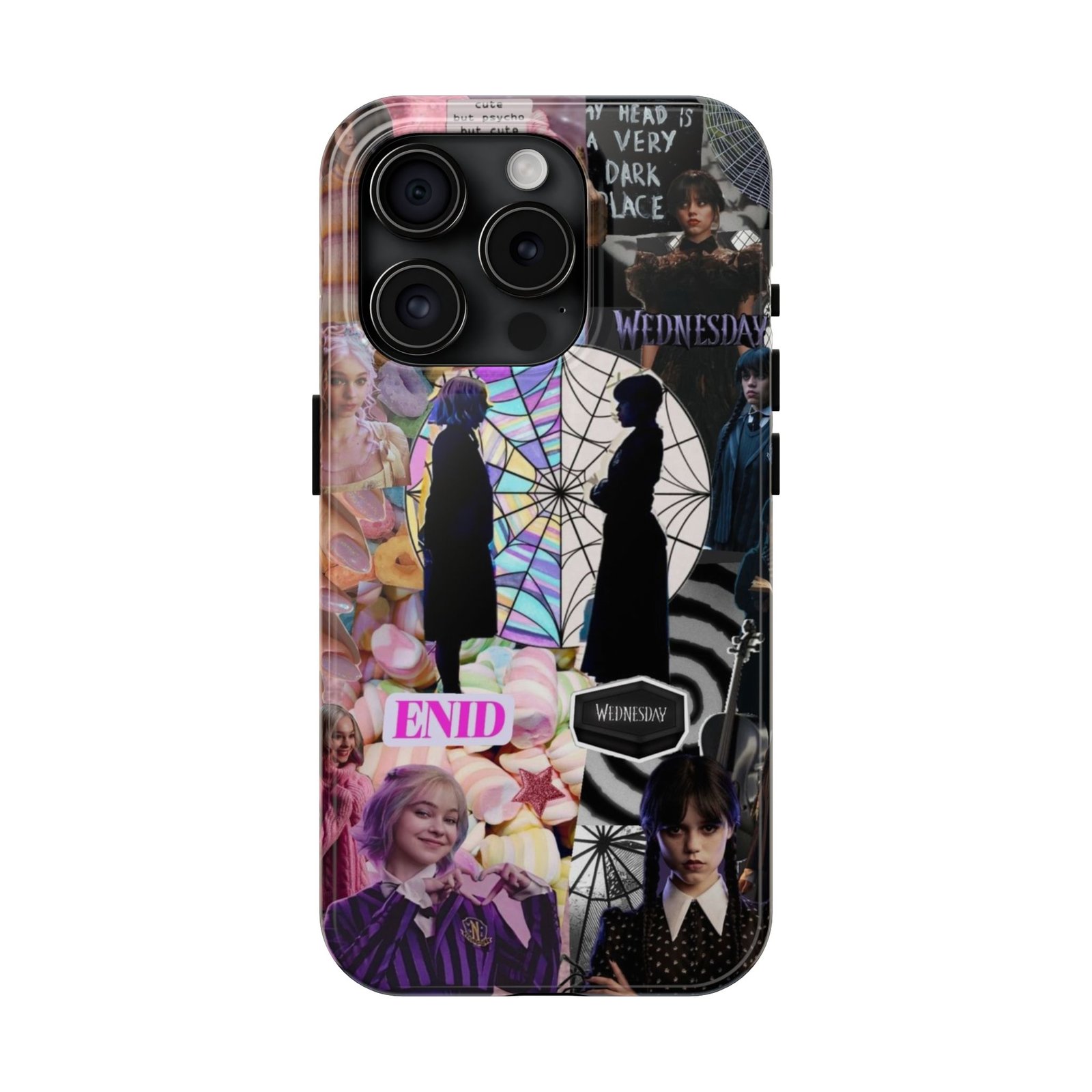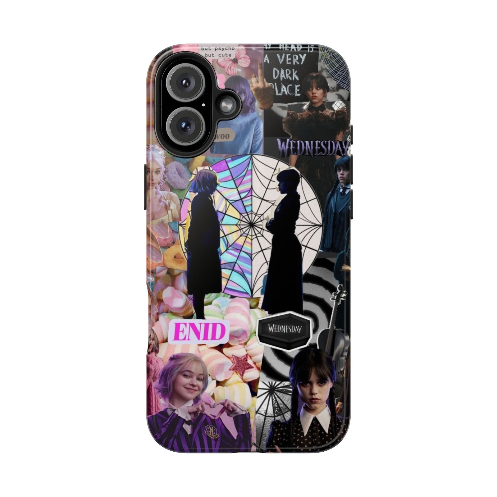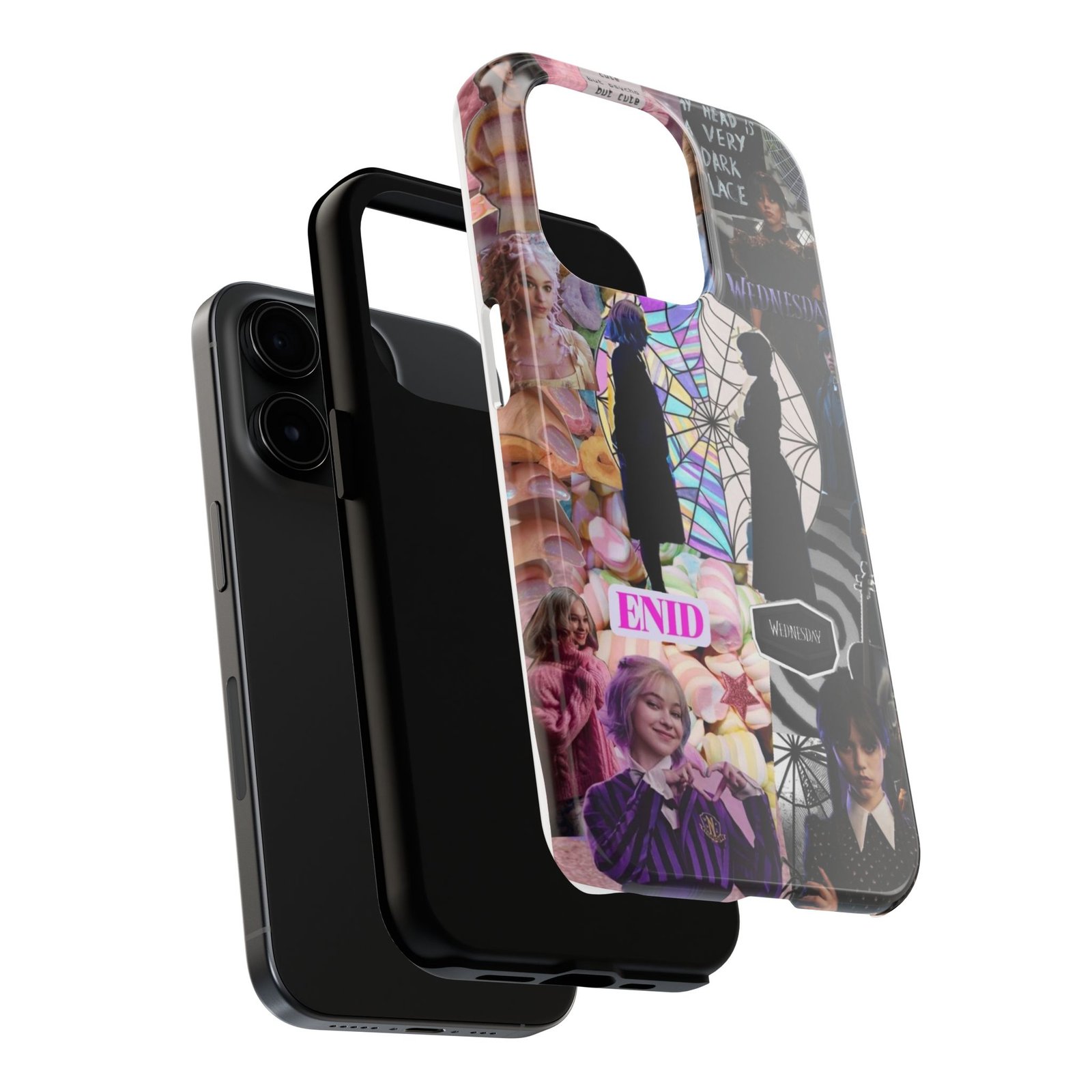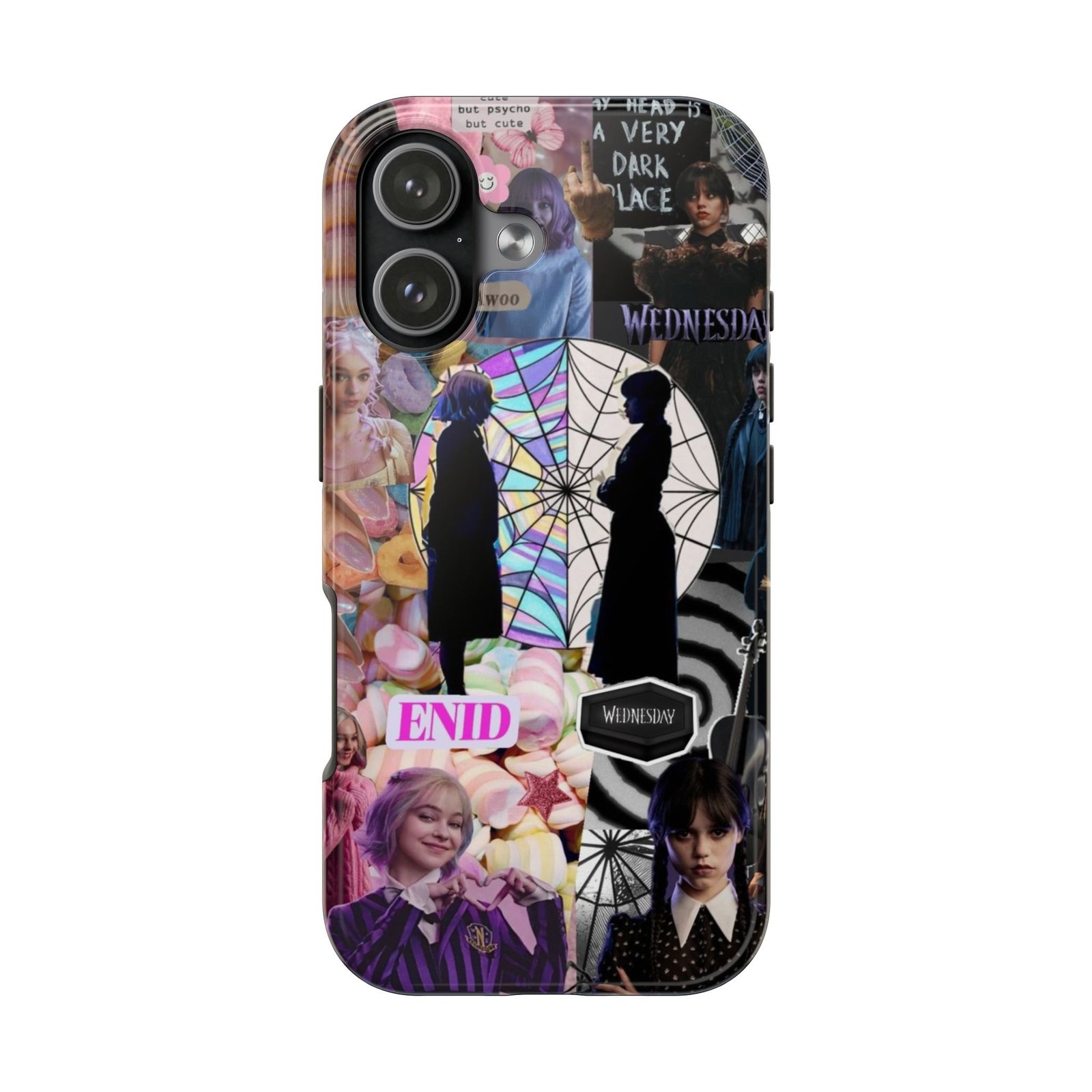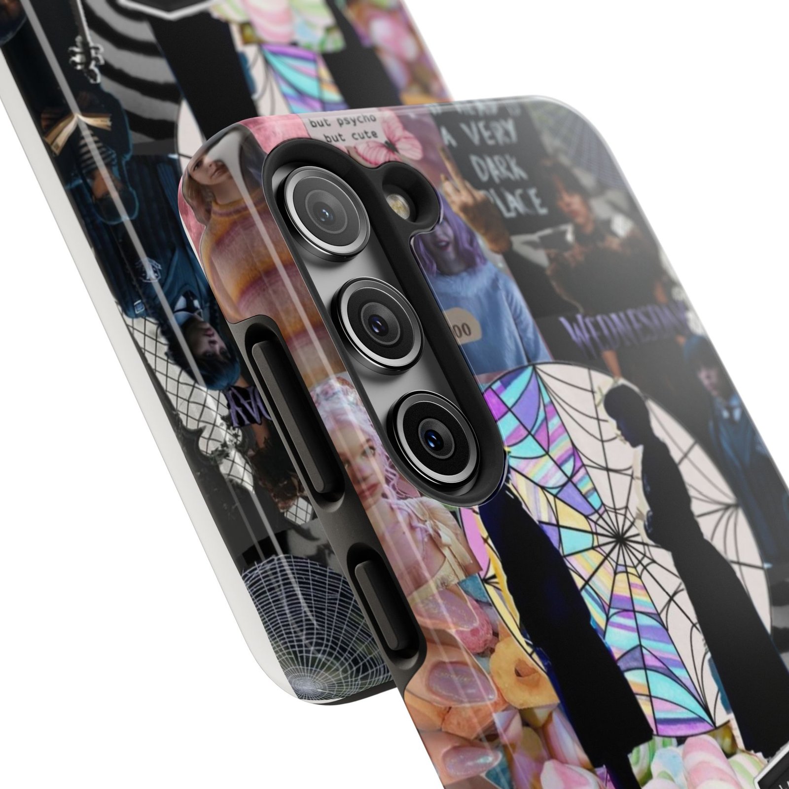 A splash of moody charm for your daily carry. This durable phone case blends glossy, high-definition art with tough, impact-resistant construction so your phone looks expressive without sacrificing protection. The design layers shadowy silhouettes, stained-glass spiderweb motifs, and soft pastel florals to create a slightly spooky, nostalgic collage that feels hand-curated. Lightweight yet sturdy, it slips on easily and keeps your screen raised off flat surfaces. Carry a piece of your aesthetic everywhere — from late-night coffee runs to study sessions and themed meetups.