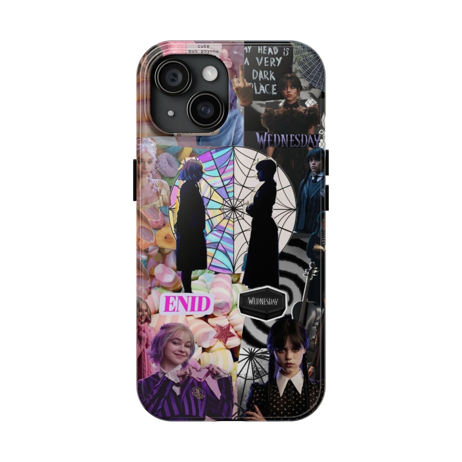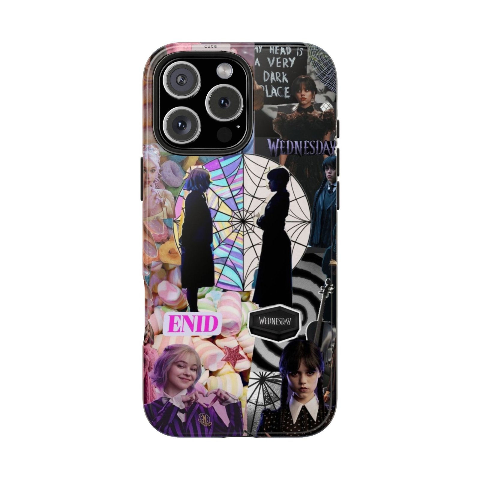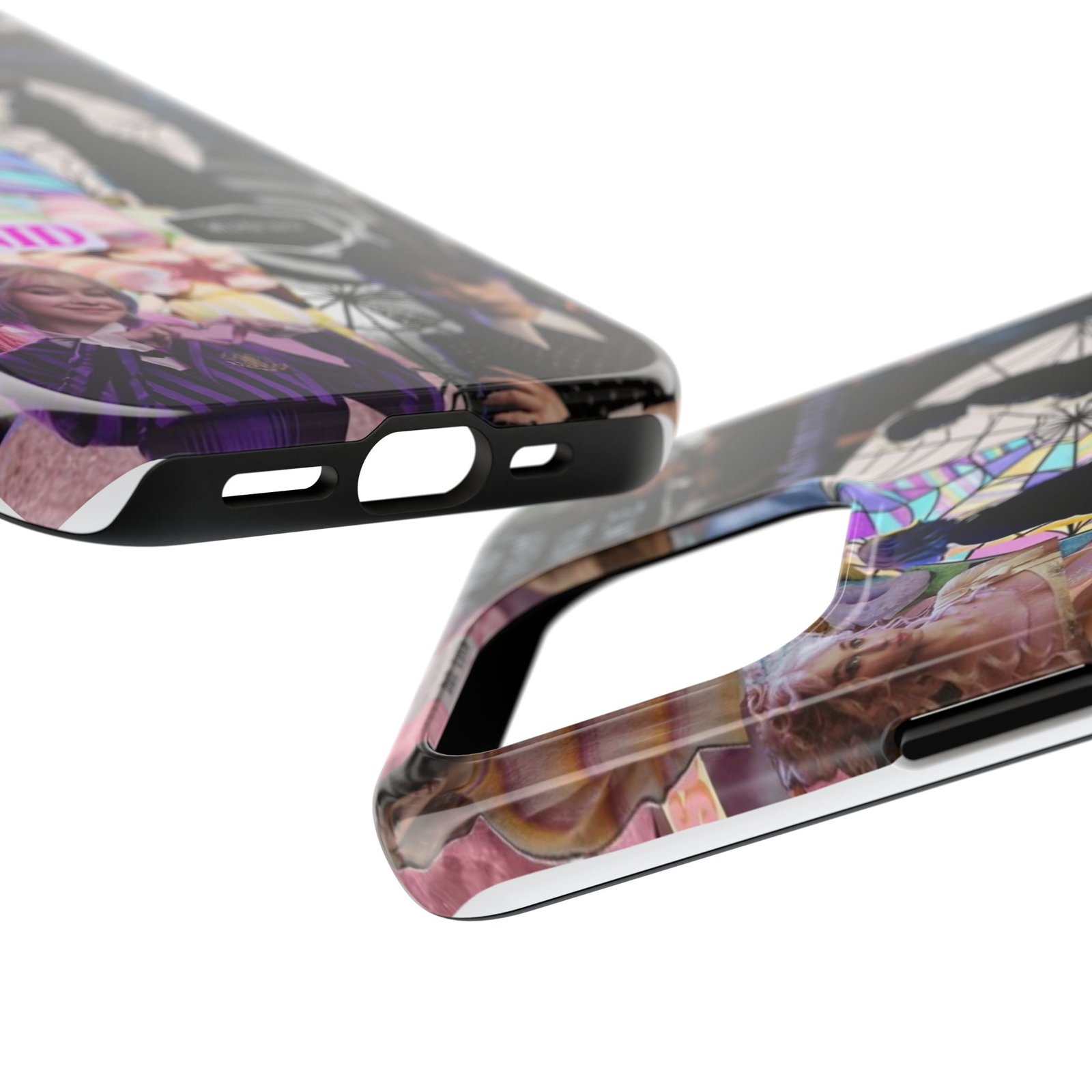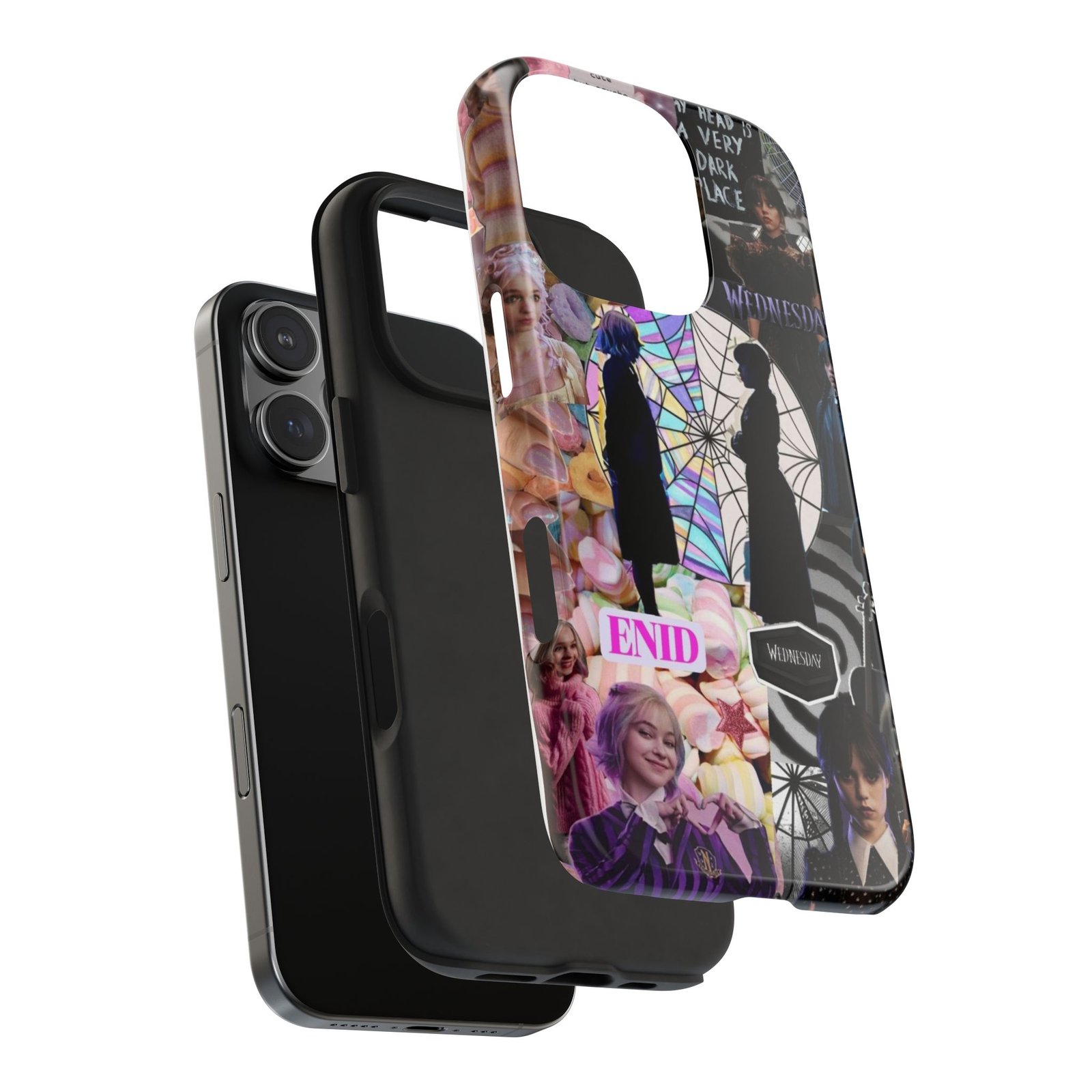 A splash of moody charm for your daily carry. This durable phone case blends glossy, high-definition art with tough, impact-resistant construction so your phone looks expressive without sacrificing protection. The design layers shadowy silhouettes, stained-glass spiderweb motifs, and soft pastel florals to create a slightly spooky, nostalgic collage that feels hand-curated. Lightweight yet sturdy, it slips on easily and keeps your screen raised off flat surfaces. Carry a piece of your aesthetic everywhere — from late-night coffee runs to study sessions and themed meetups.