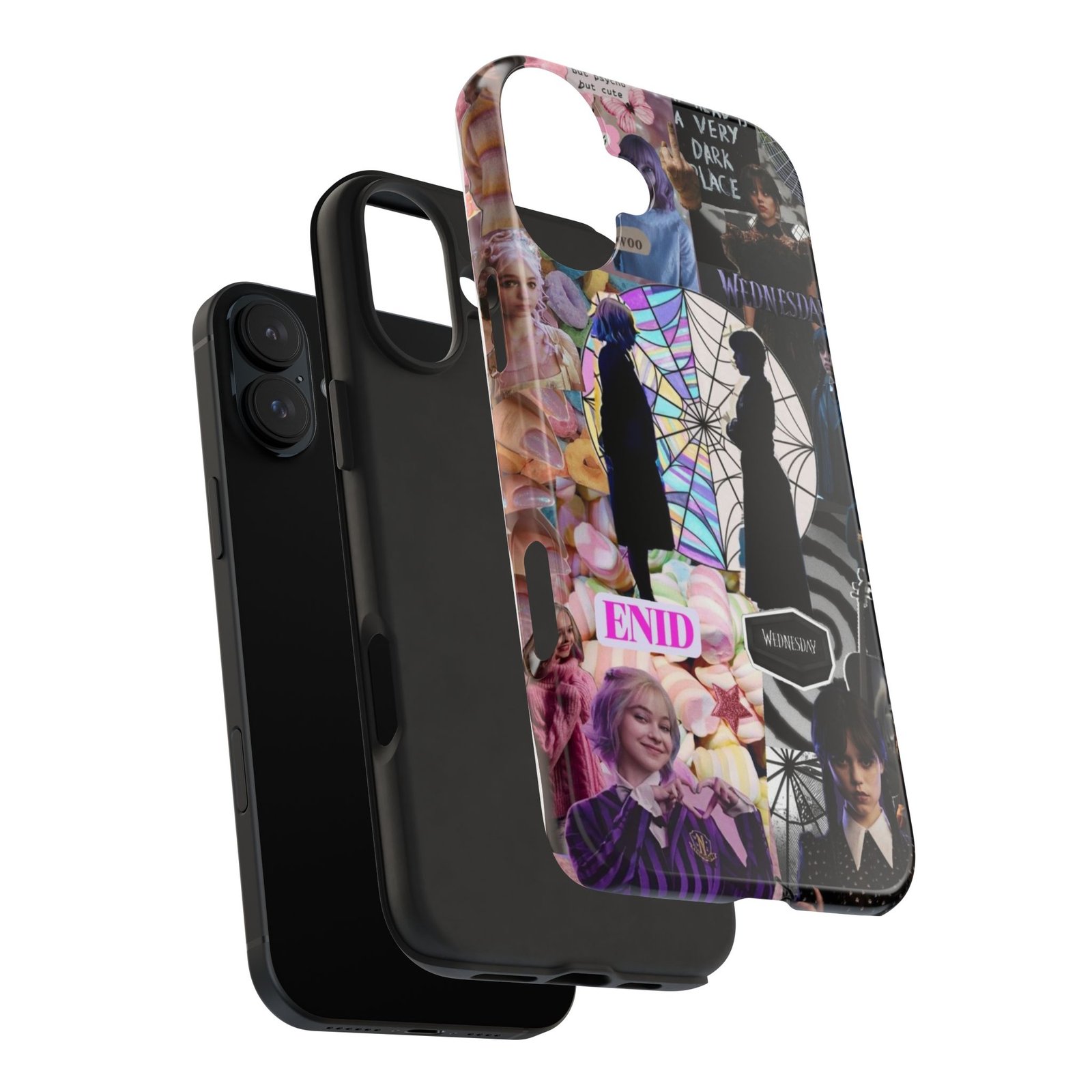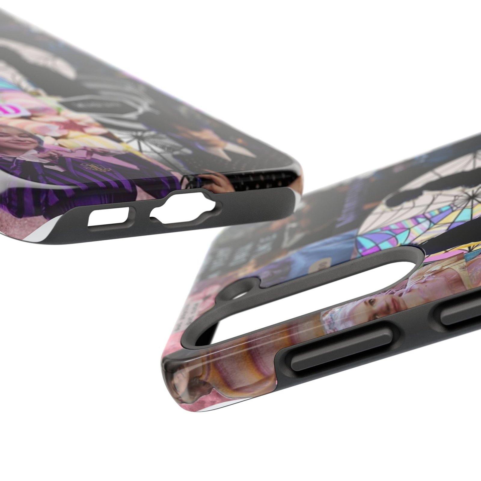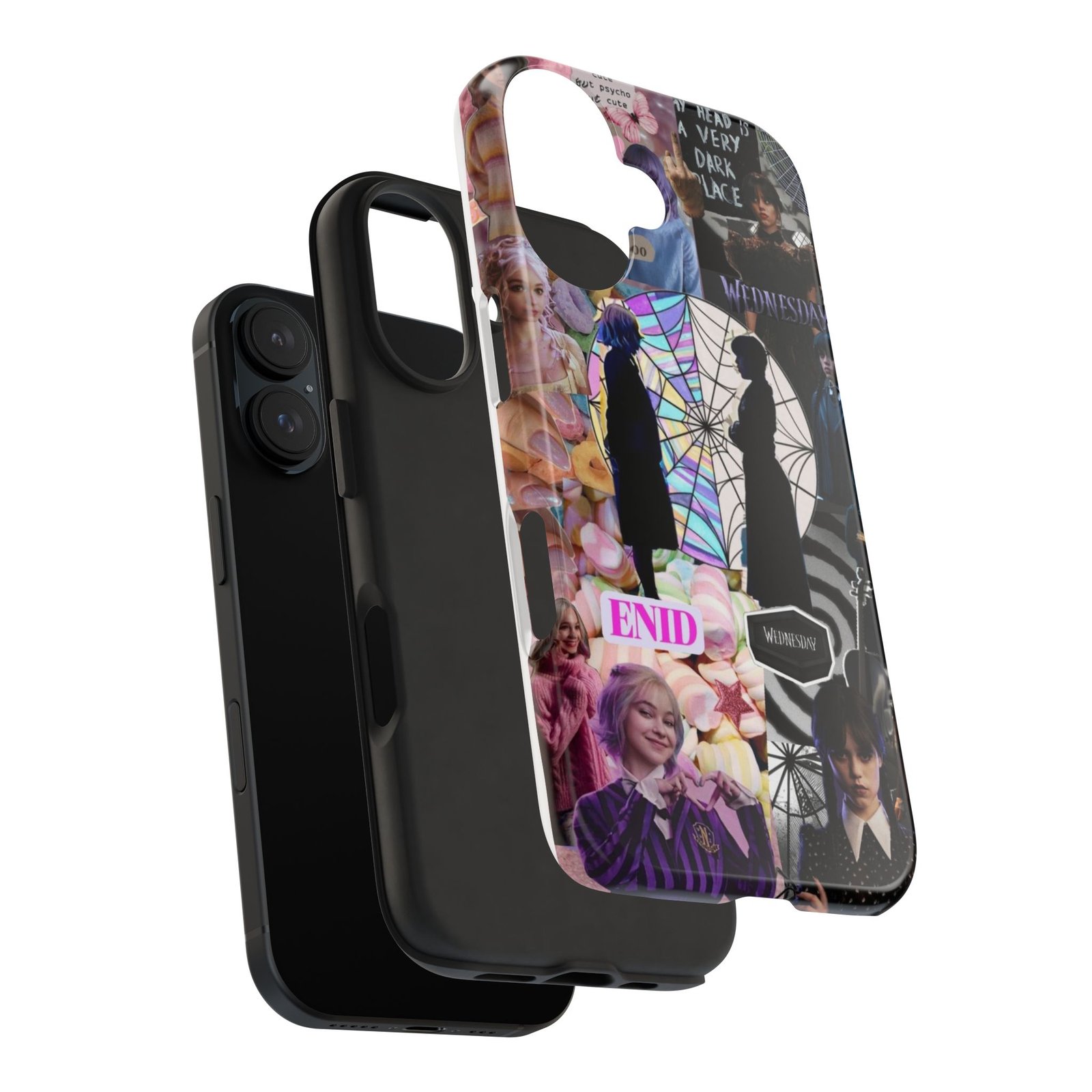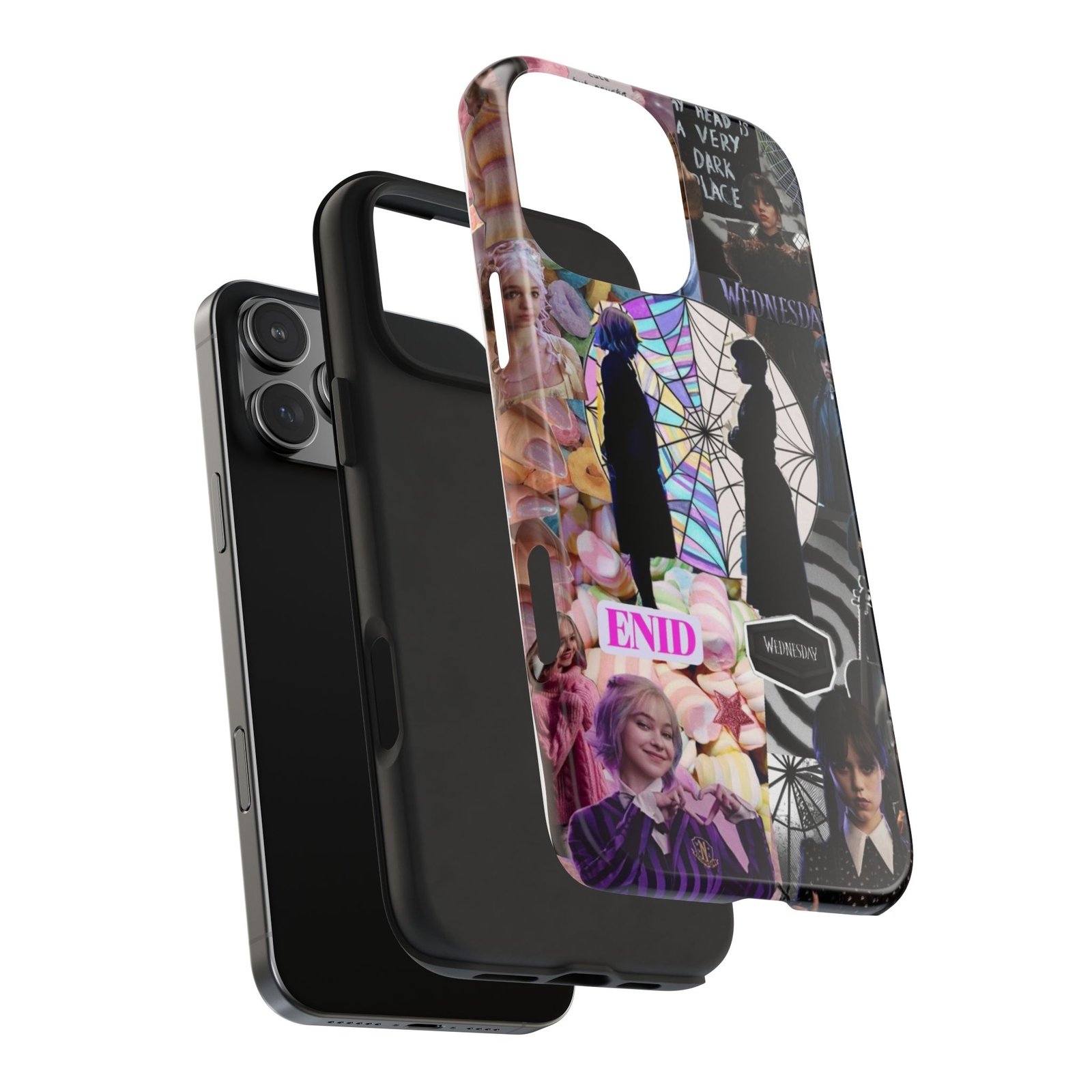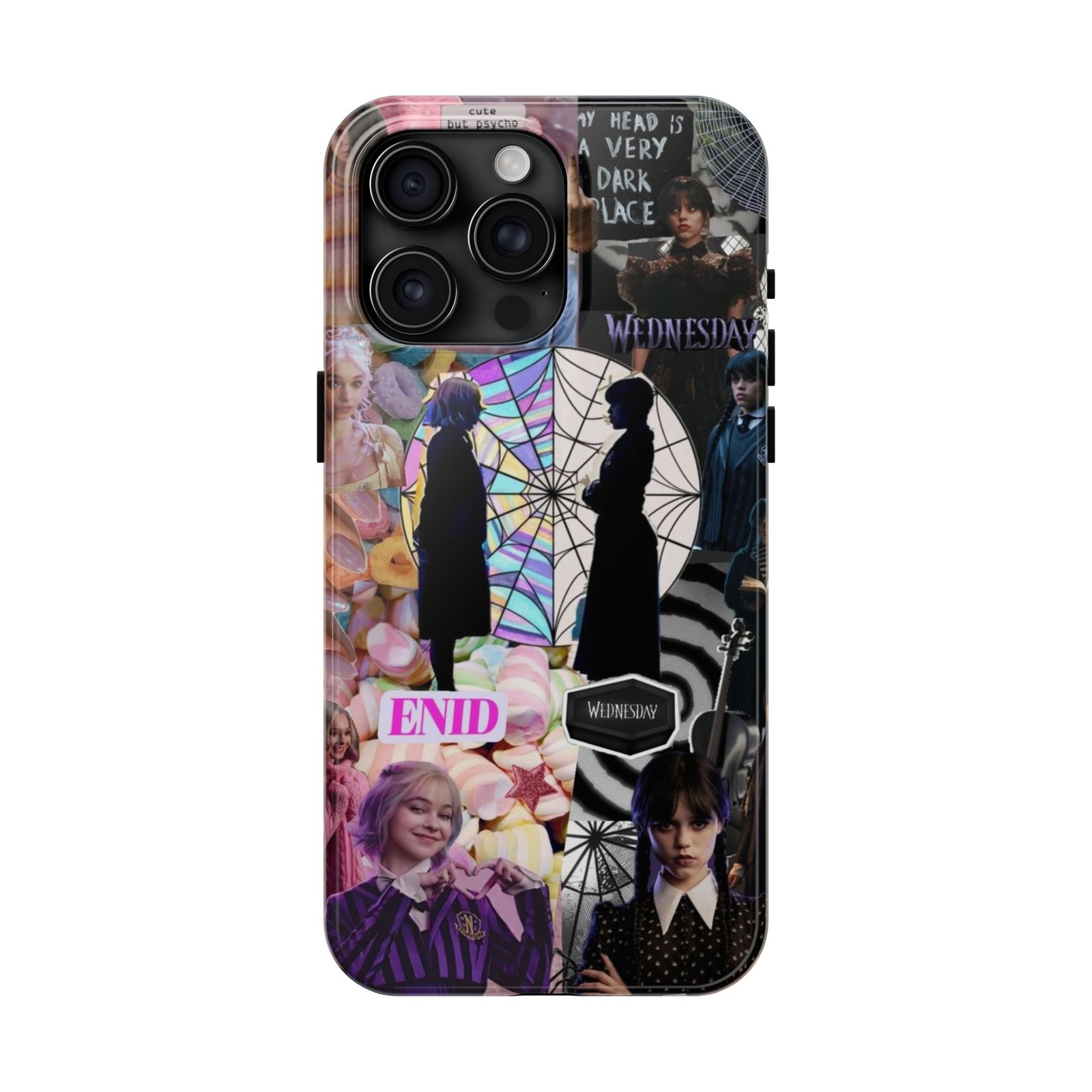 A splash of moody charm for your daily carry. This durable phone case blends glossy, high-definition art with tough, impact-resistant construction so your phone looks expressive without sacrificing protection. The design layers shadowy silhouettes, stained-glass spiderweb motifs, and soft pastel florals to create a slightly spooky, nostalgic collage that feels hand-curated. Lightweight yet sturdy, it slips on easily and keeps your screen raised off flat surfaces. Carry a piece of your aesthetic everywhere — from late-night coffee runs to study sessions and themed meetups.