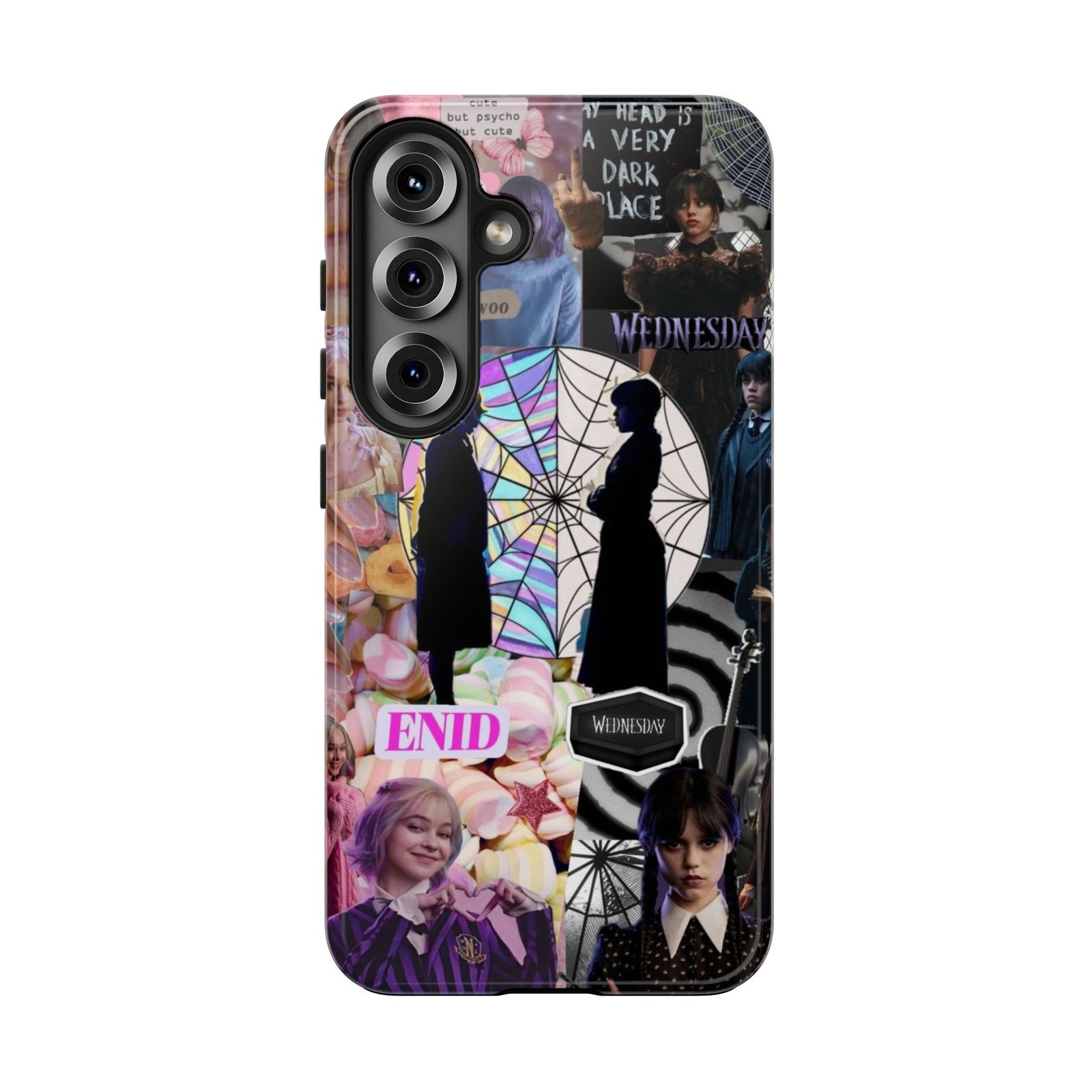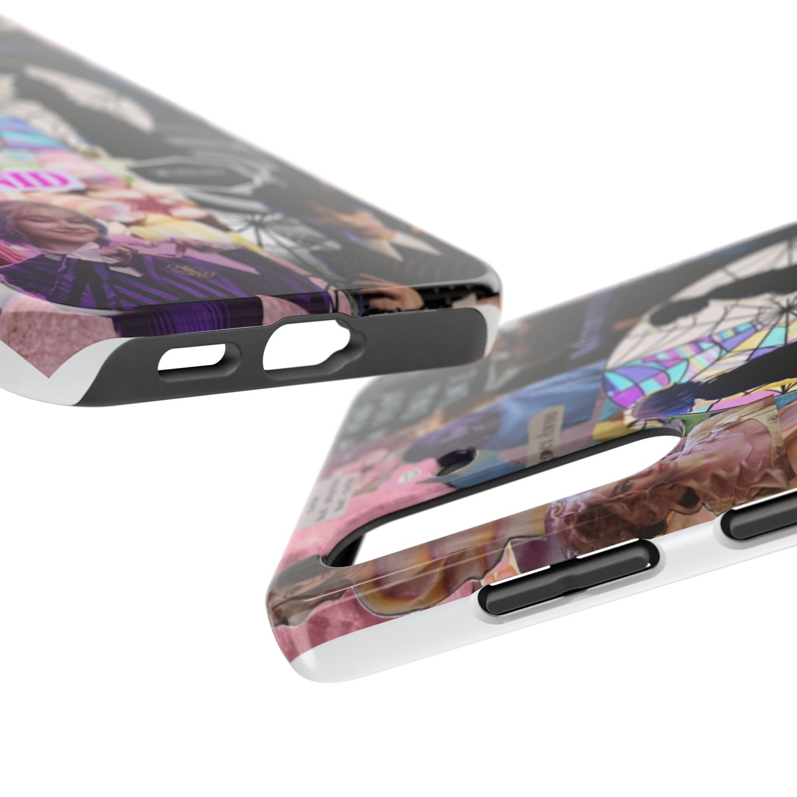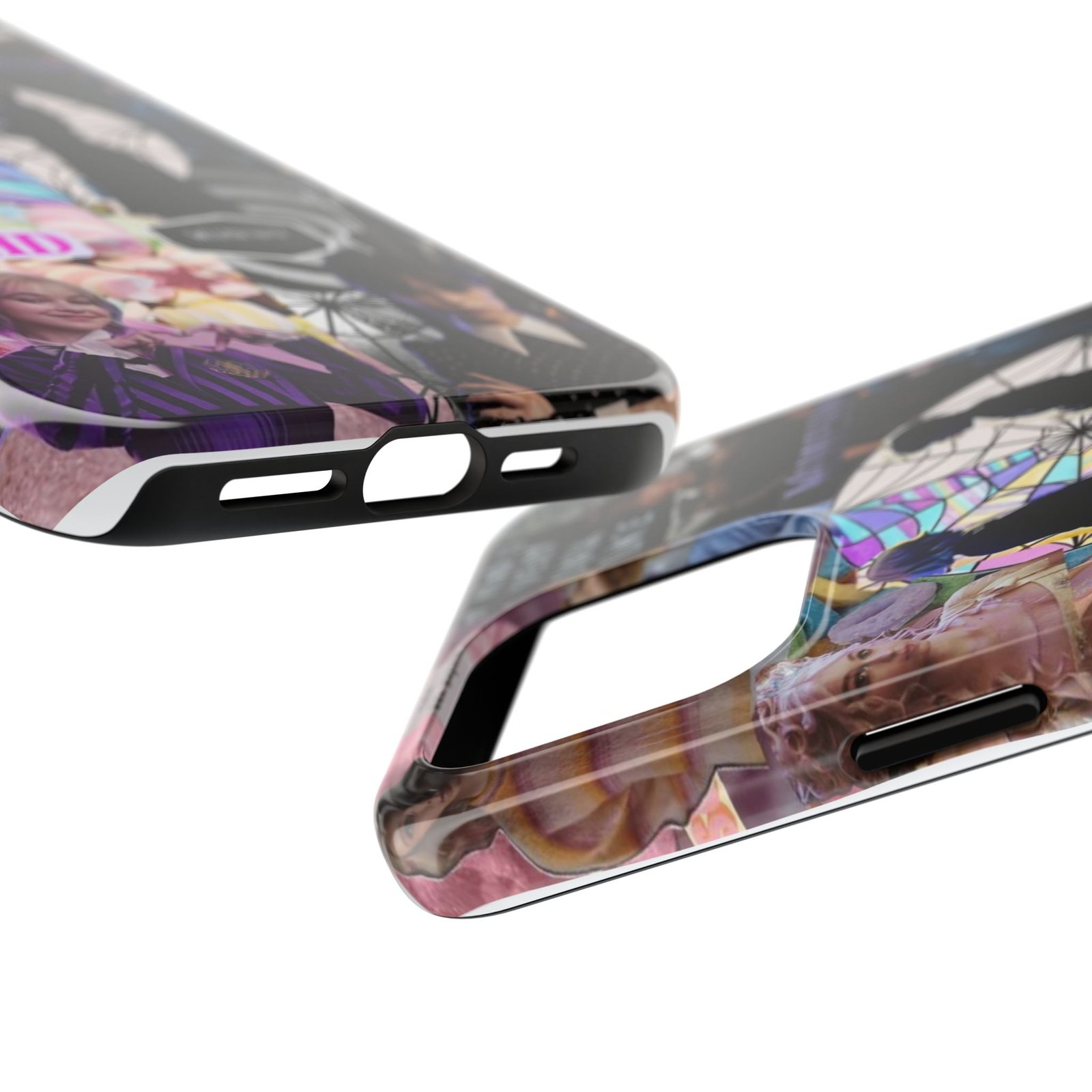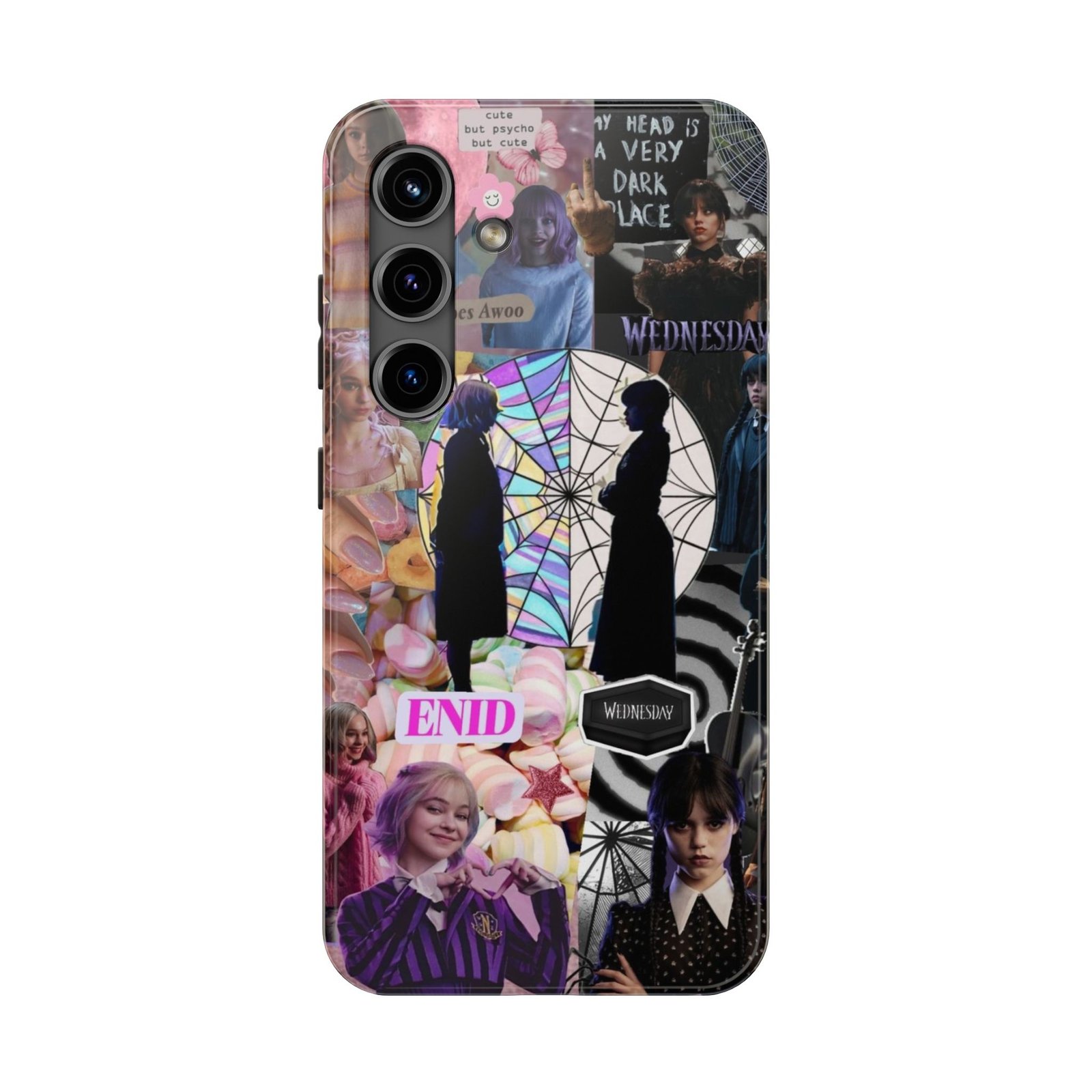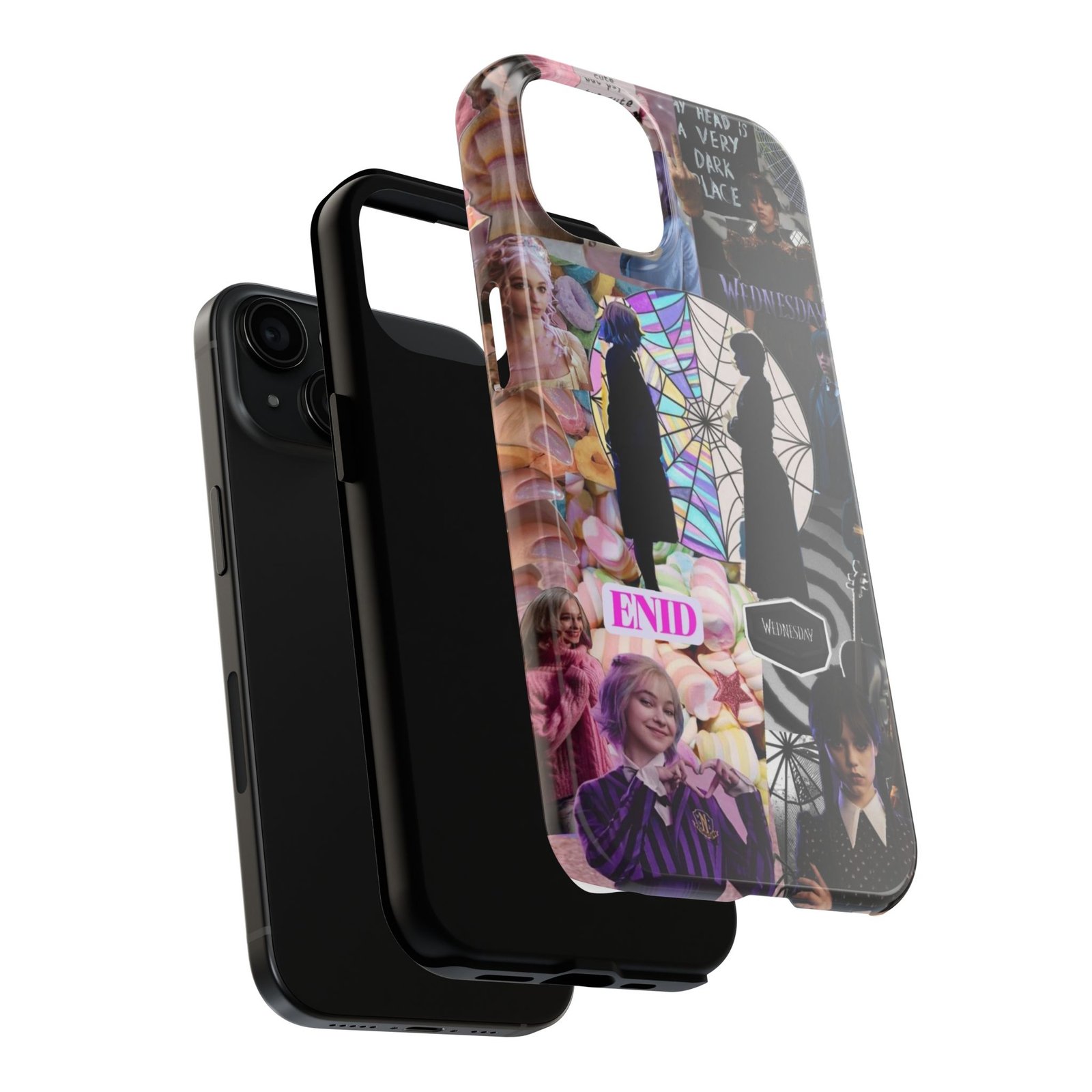 A splash of moody charm for your daily carry. This durable phone case blends glossy, high-definition art with tough, impact-resistant construction so your phone looks expressive without sacrificing protection. The design layers shadowy silhouettes, stained-glass spiderweb motifs, and soft pastel florals to create a slightly spooky, nostalgic collage that feels hand-curated. Lightweight yet sturdy, it slips on easily and keeps your screen raised off flat surfaces. Carry a piece of your aesthetic everywhere — from late-night coffee runs to study sessions and themed meetups.