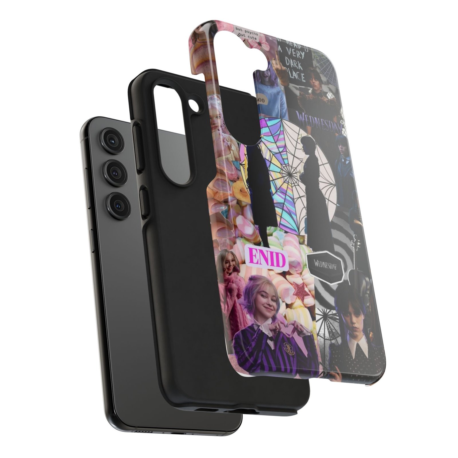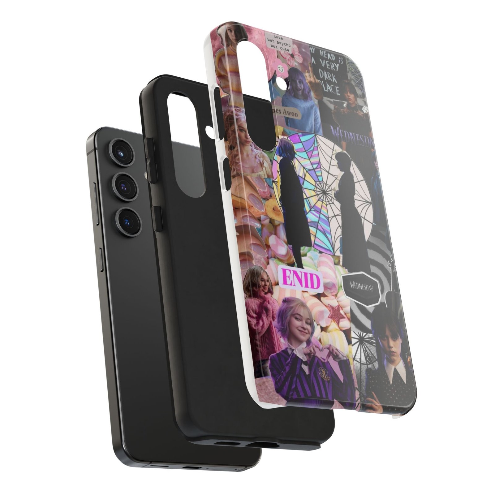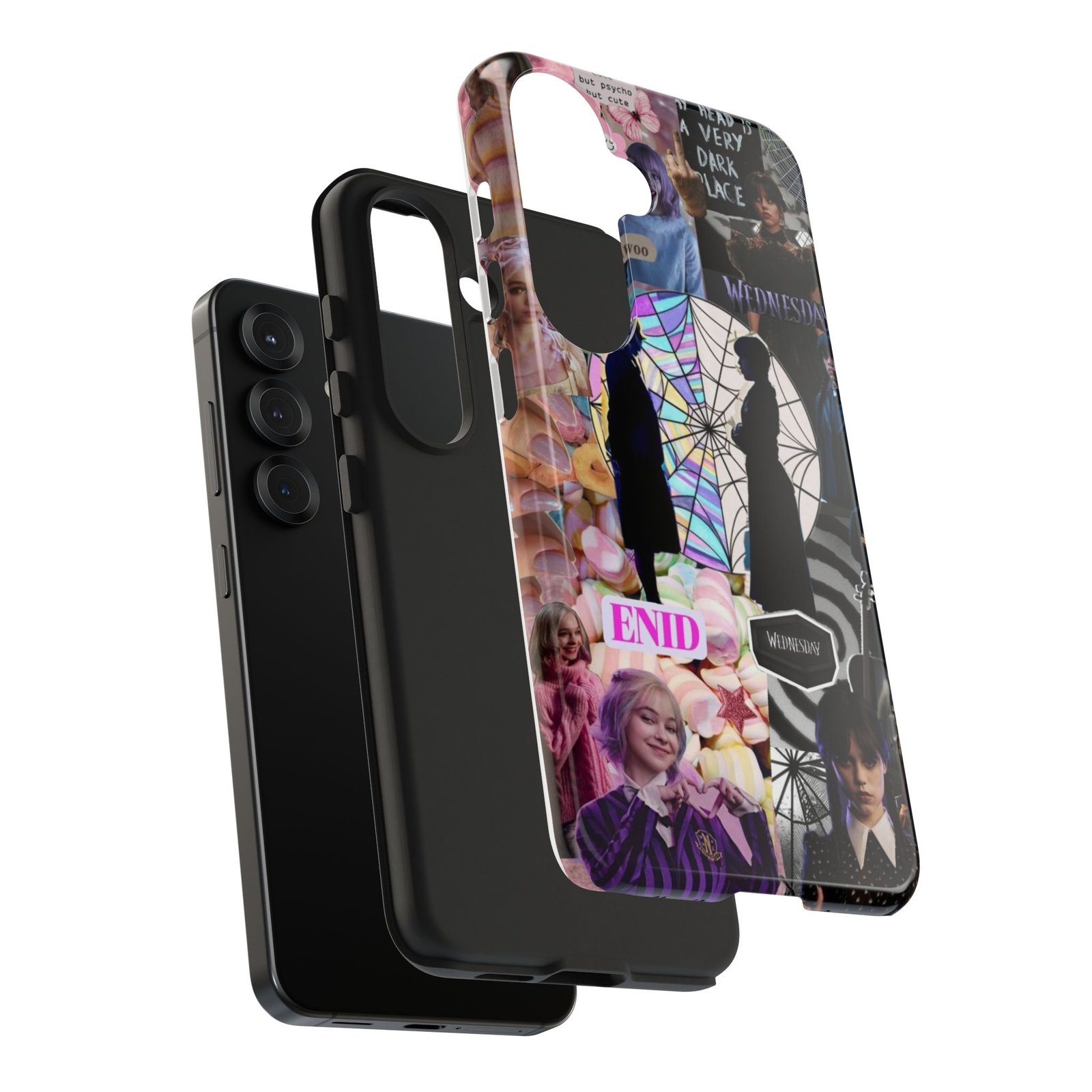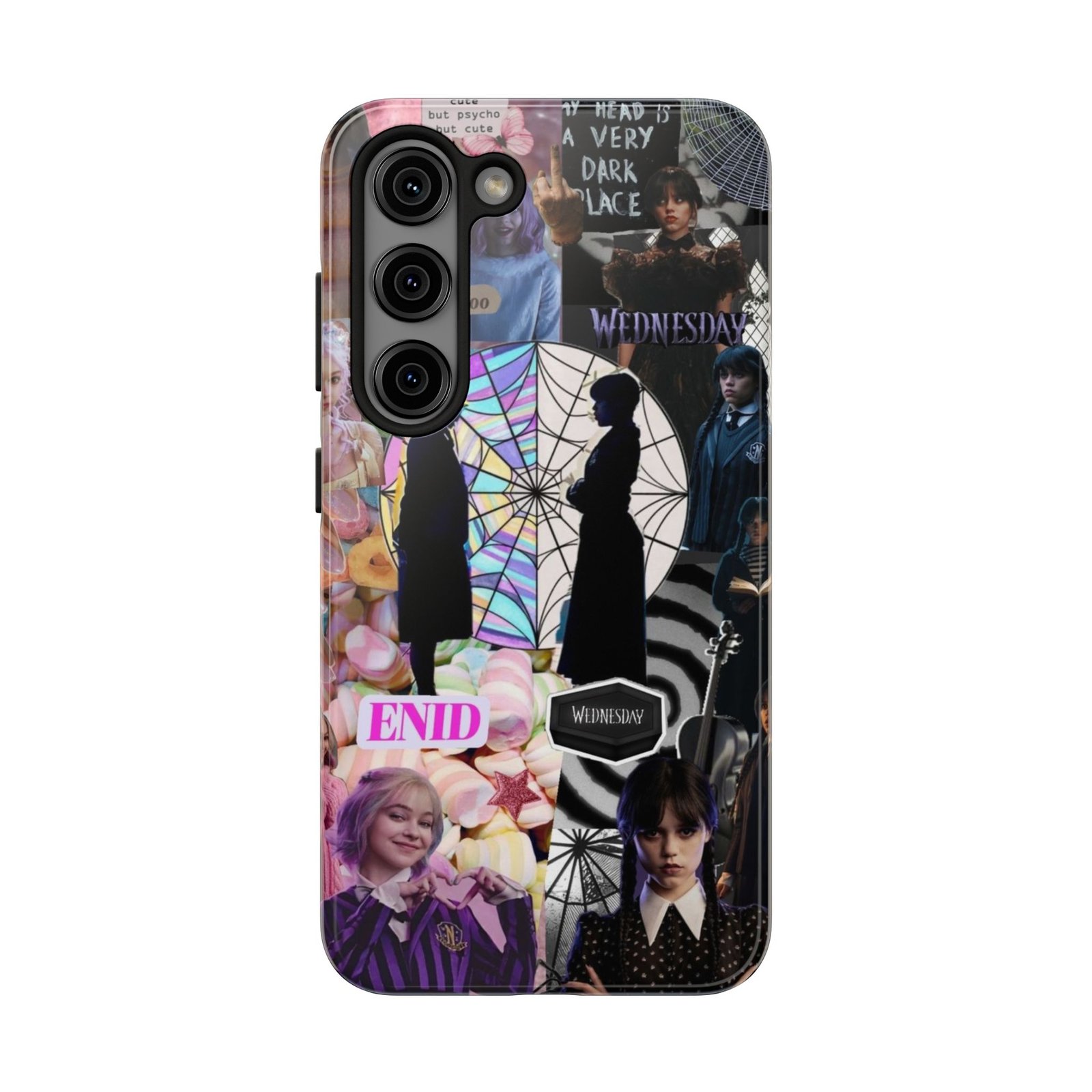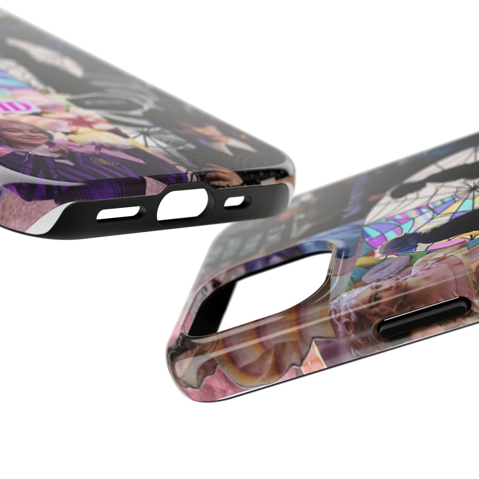 A splash of moody charm for your daily carry. This durable phone case blends glossy, high-definition art with tough, impact-resistant construction so your phone looks expressive without sacrificing protection. The design layers shadowy silhouettes, stained-glass spiderweb motifs, and soft pastel florals to create a slightly spooky, nostalgic collage that feels hand-curated. Lightweight yet sturdy, it slips on easily and keeps your screen raised off flat surfaces. Carry a piece of your aesthetic everywhere — from late-night coffee runs to study sessions and themed meetups.